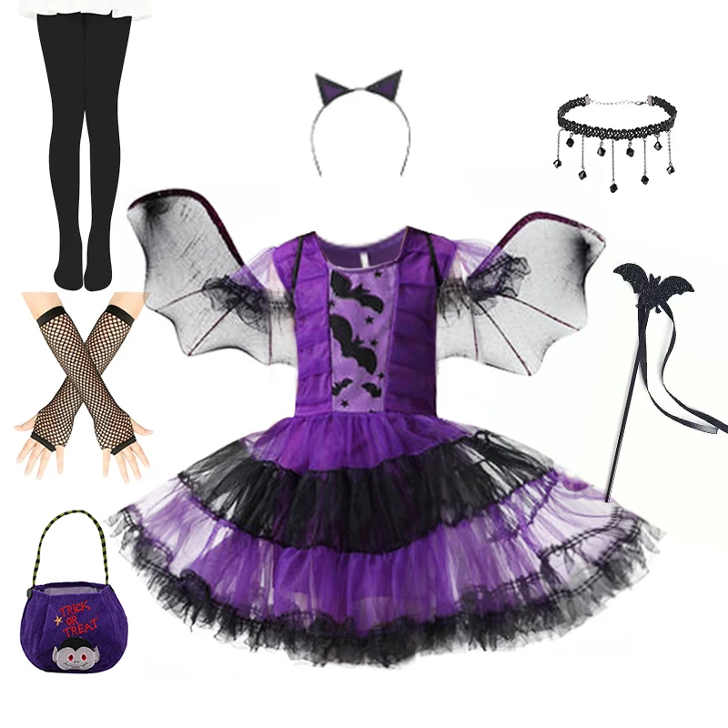 Kid Size: 13, Color: Rose Red - Halloween Children Purple Vampire Costume Girls Dress Kids Clothes Baby Bat Spider Party Cosplay Headband +Wing Outfit