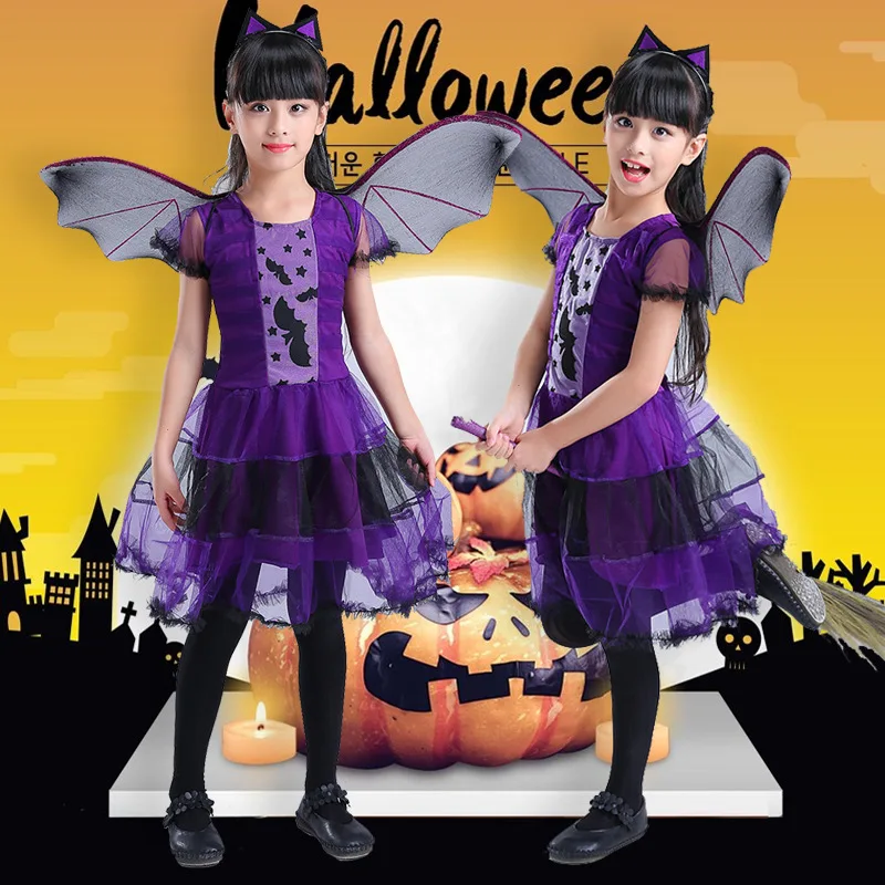 Kid Size: 2T, Color: black - Halloween Children Purple Vampire Costume Girls Dress Kids Clothes Baby Bat Spider Party Cosplay Headband +Wing Outfit