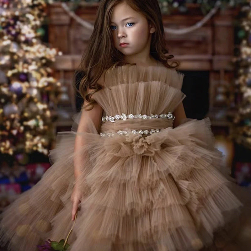 Kid Size: 2T, Color: Coffee - Baby Girls Princess Dress Sleeveless High Waist Children Mesh Tutu Dresses Girls Birthday Party Clothing Kids Wedding Dress New