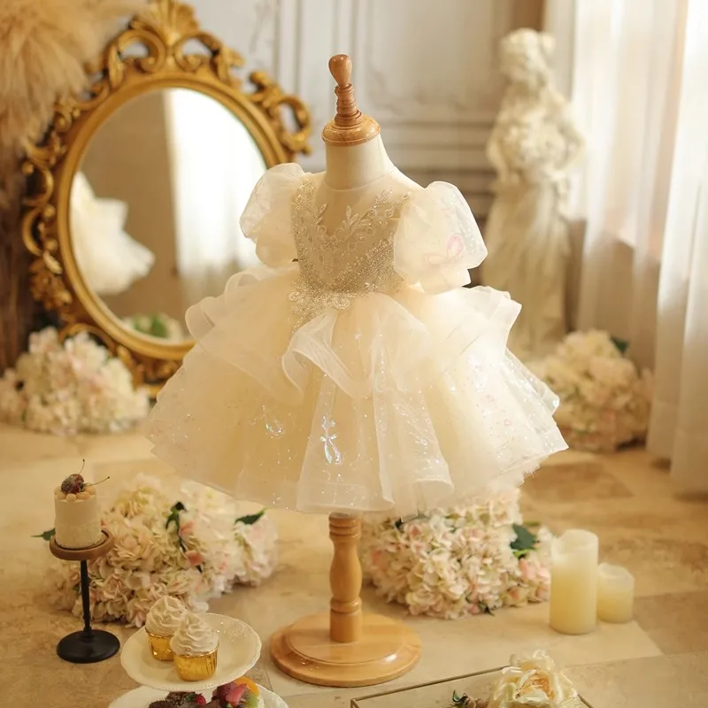 Kid Size: 5, Color: Khaki - Baby Girls Birthday Dress Elegant Princess Gown High-End Sequin Tulle Tutu Dresses Cake Special Occasions Toddler Party Clothes