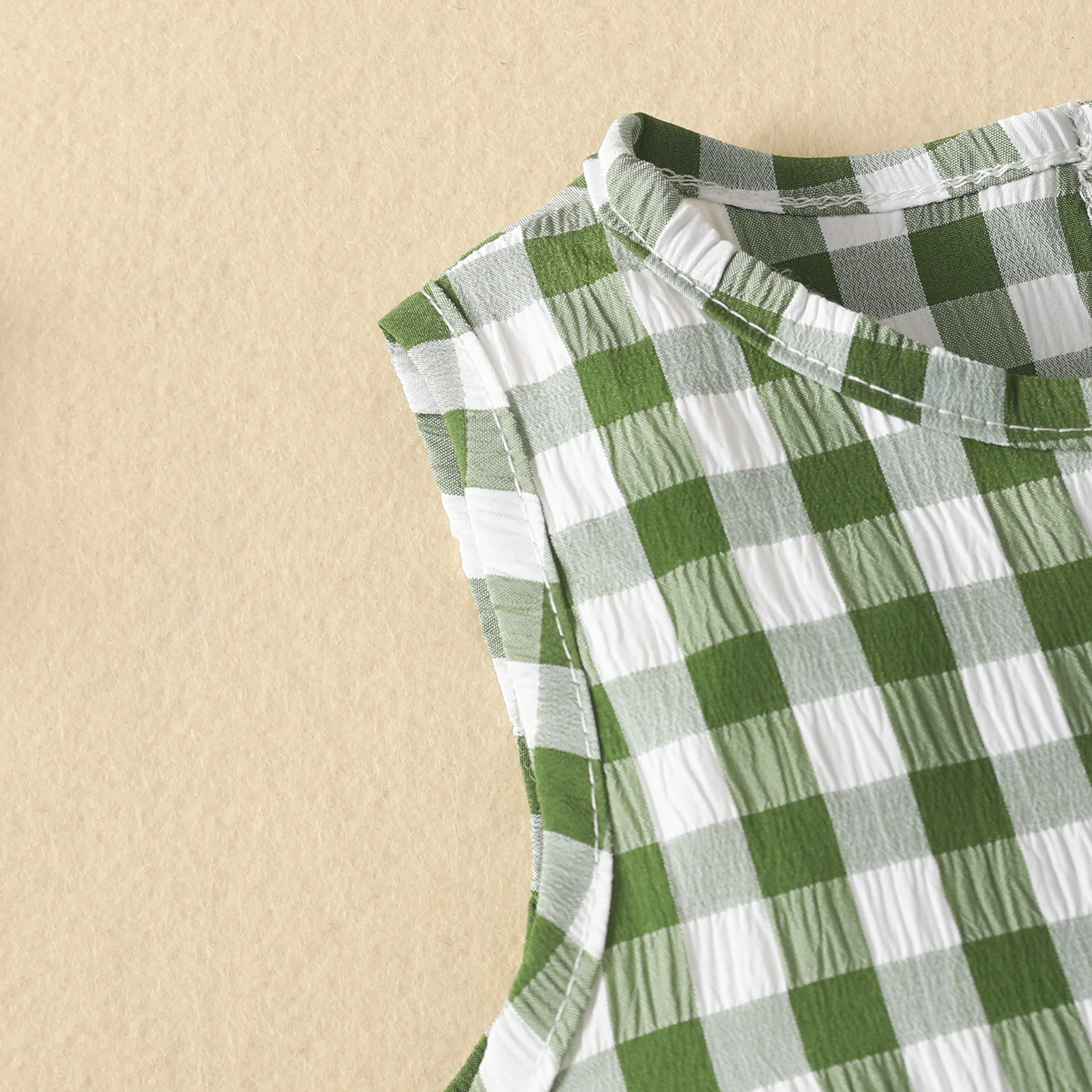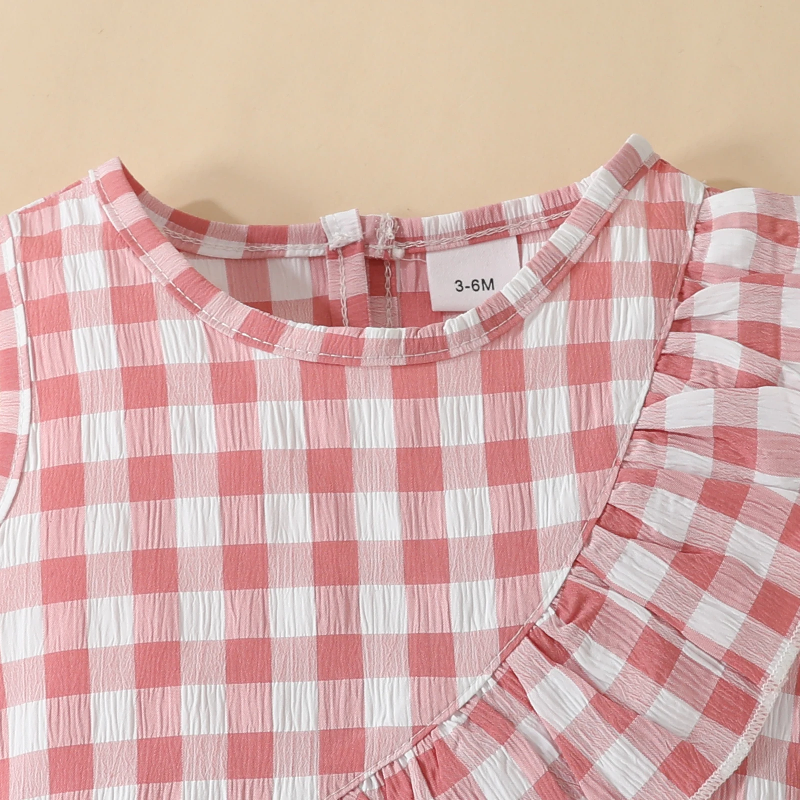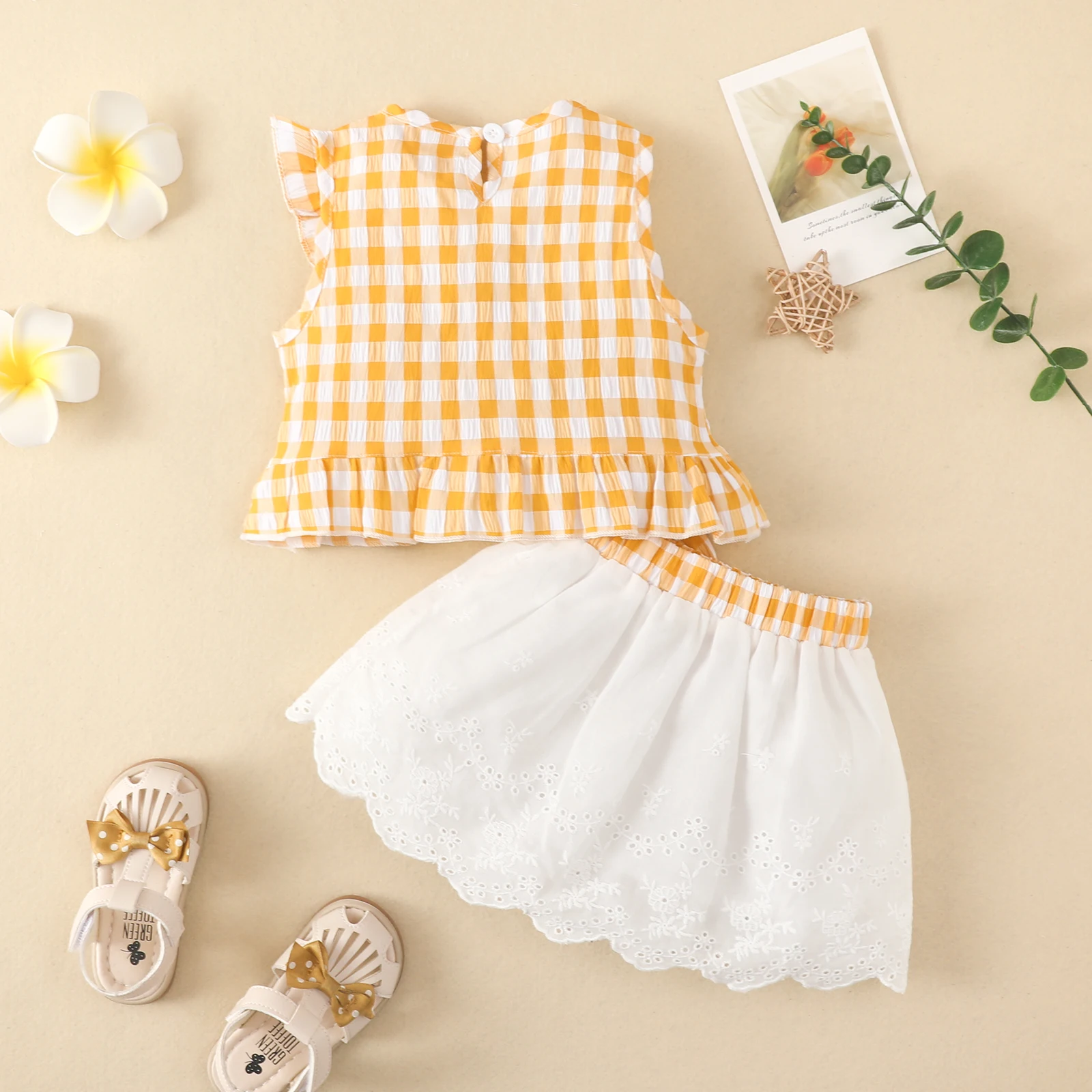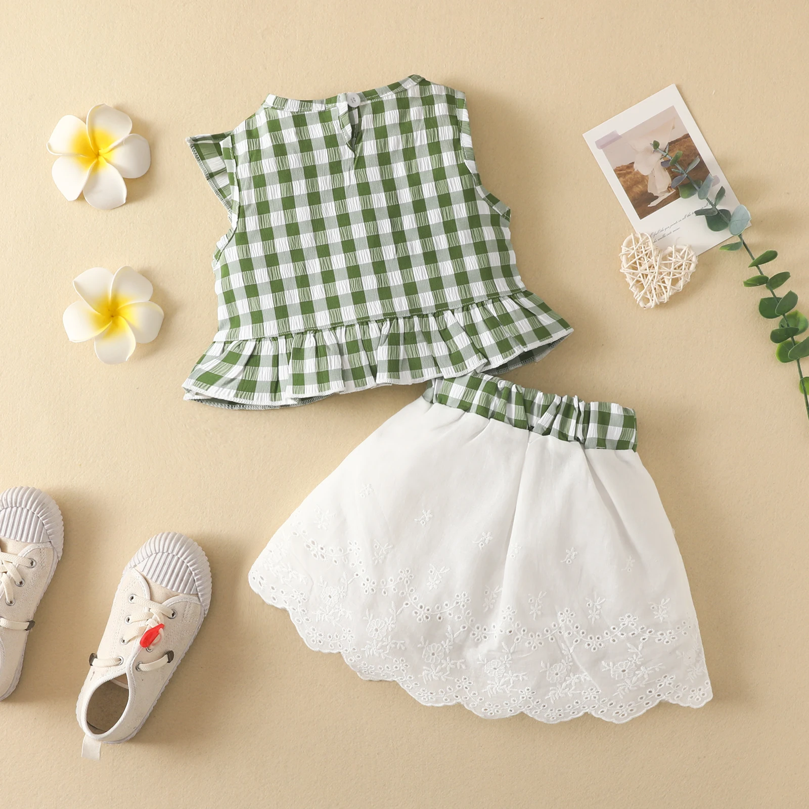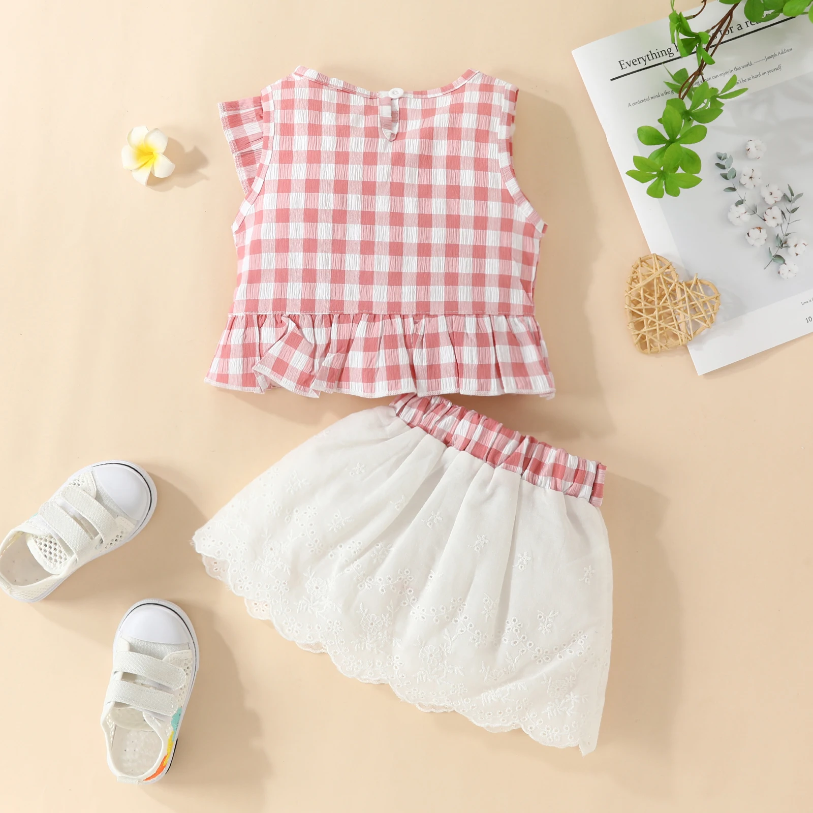 Kid Size: 9M, Color: Blue - Charming Girls' Summer Ensemble: Sleeveless Plaid Ruffle Top & Lace Hem Skirt - Comfy, Durable & Stylish