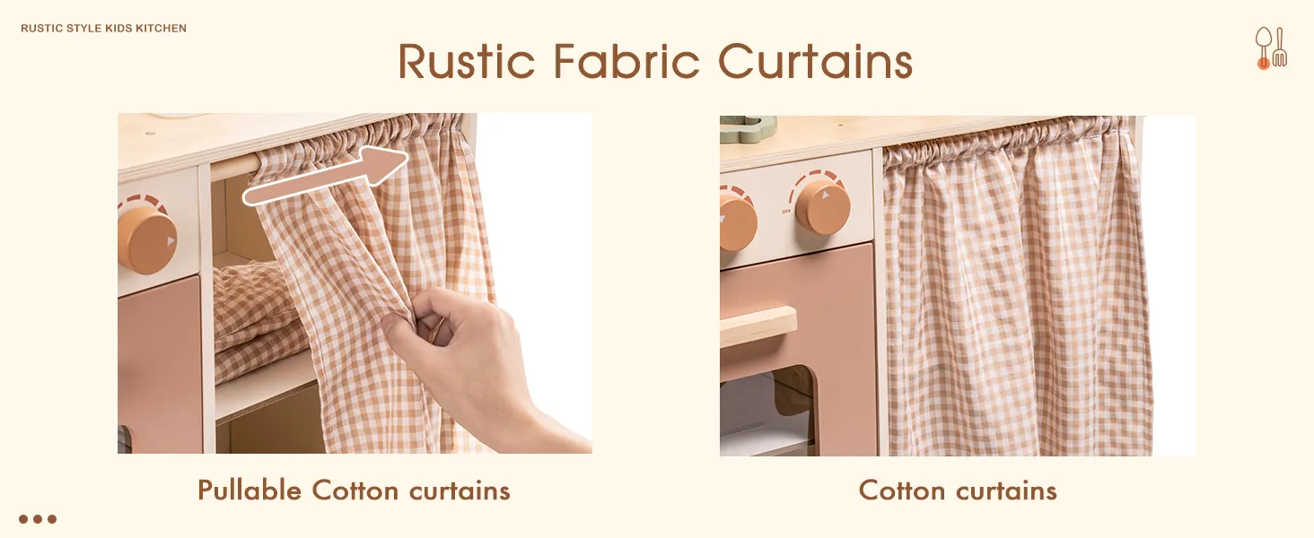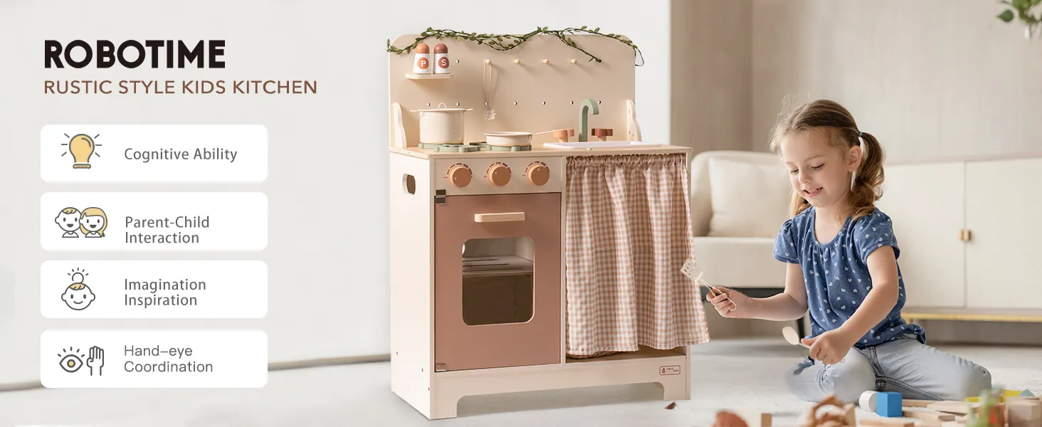 1. 【Country Style Children's Kitchen】This children's play kitchen set is known for its unique country style and delicate leaf shaped light strings. There are also a variety of rotating knobs that open and close doors and cabinets, which provide children with an authentic cooking experience.