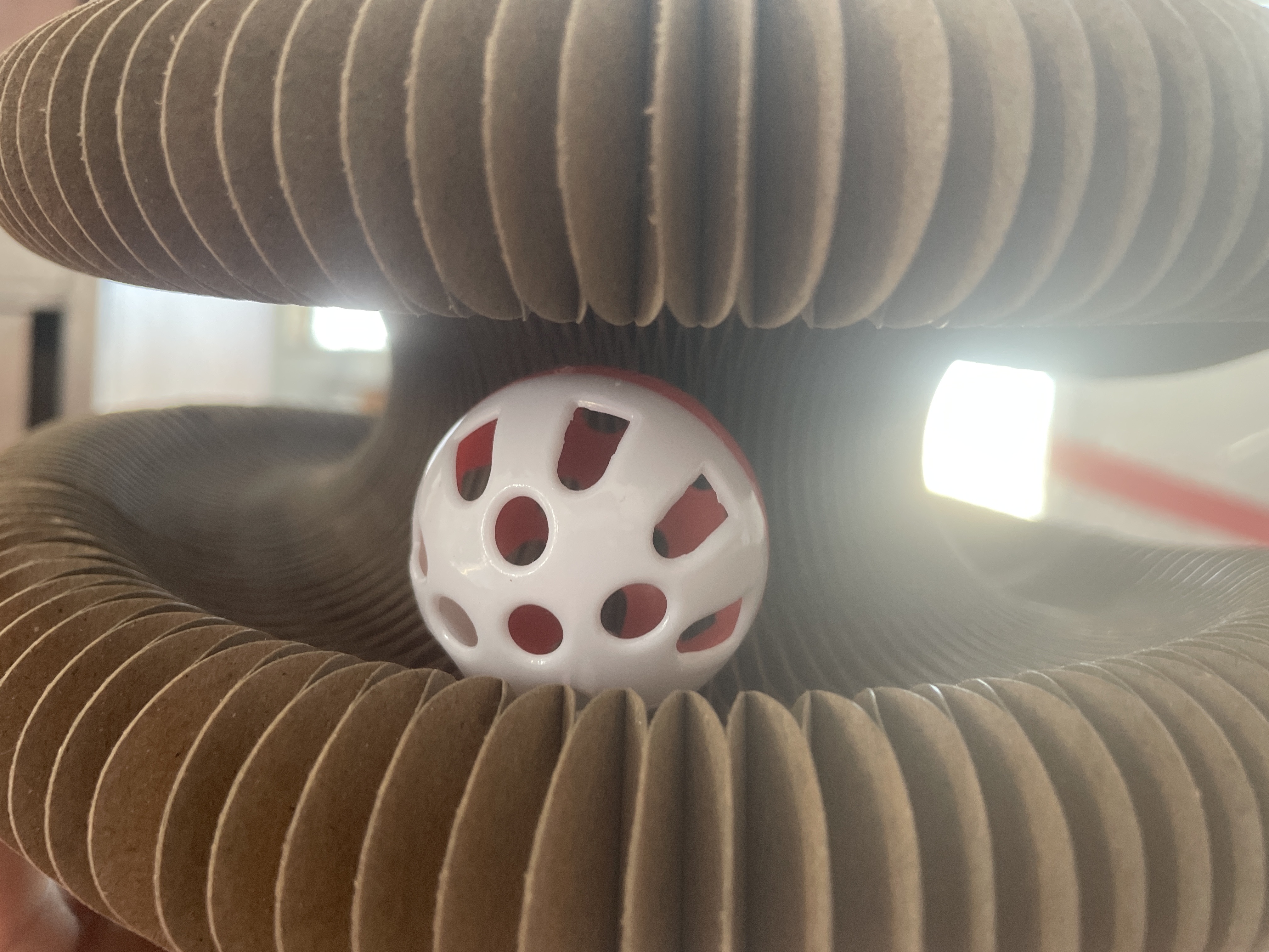 built into its design. One or more plastic balls (with jingle bells inside) sit trapped within the curved walls of the accordion. As your