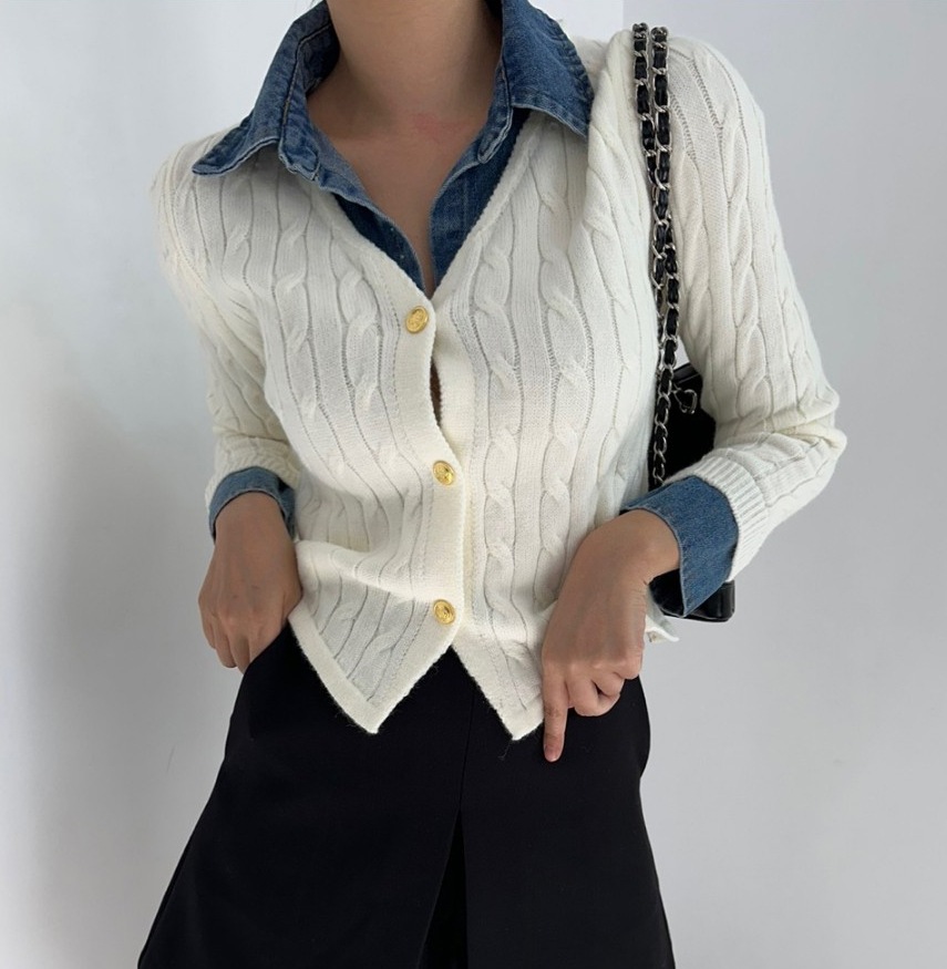 Korean Style Contrast Color Knitwear Denim Stitching Long Sleeve Sweater