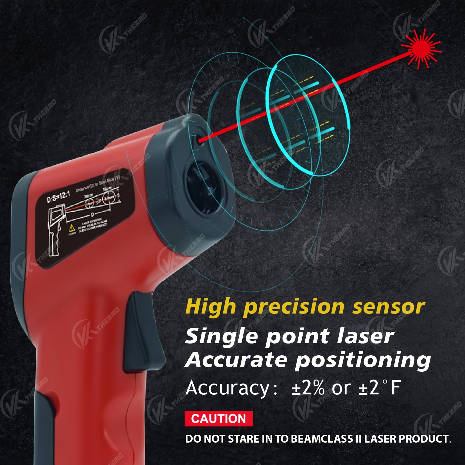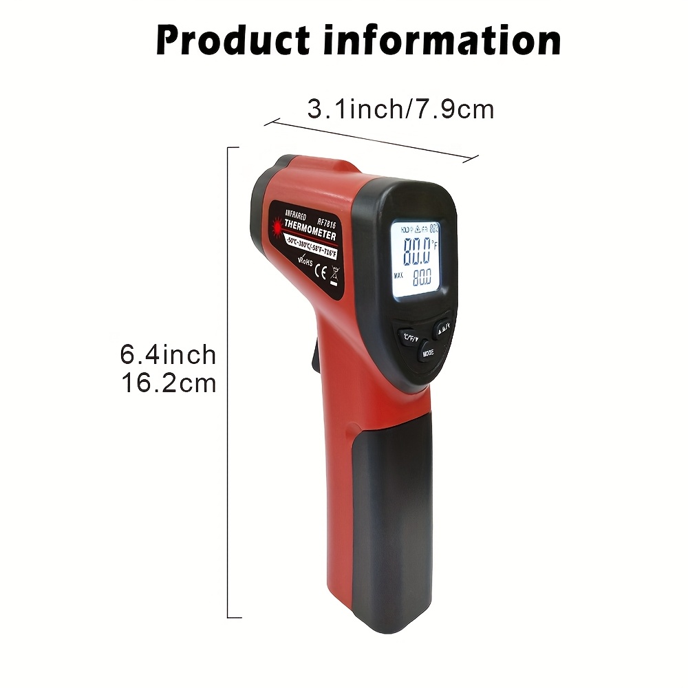 Infrared thermometer that does not require physical contact● Fast response time of 0.5 seconds ● Switch between Celsius and Fahrenheit ● Log the highest peak value ● LED illumination ● Automatic power off after 15 seconds ● Low battery alertDetails or requirementsType: non-invasive Application: Industrial thermometer Temperature range: -50℃ to 380℃ (-58℉ to 716℉) Accuracy: ±2% or 2°C Resolution: 0.1 Display type: Digital Battery: AAA Material: ABS Response time: 0.5 seconds