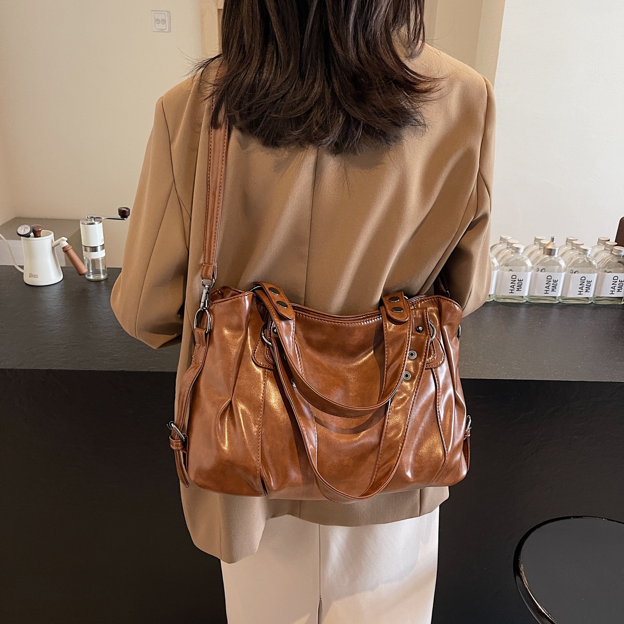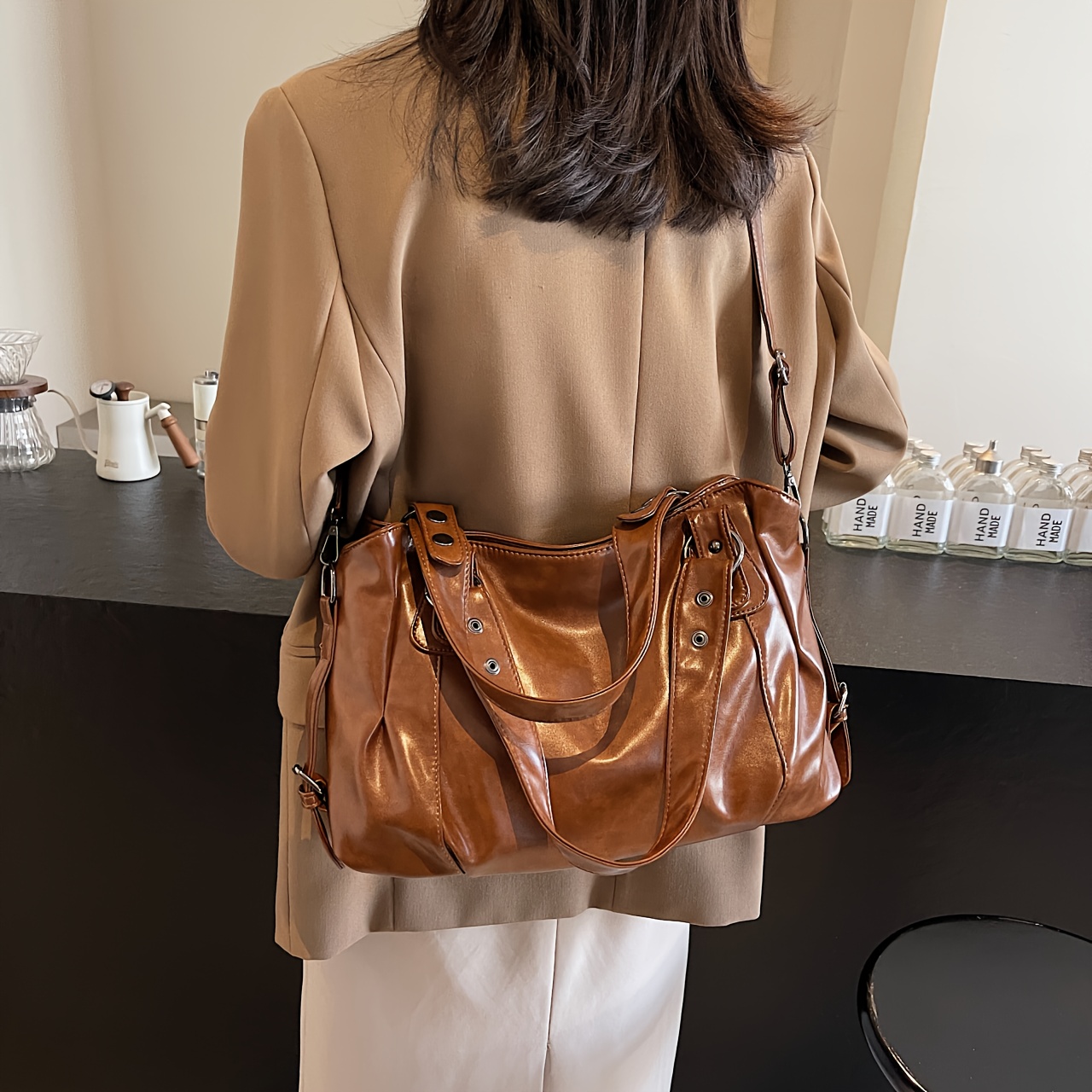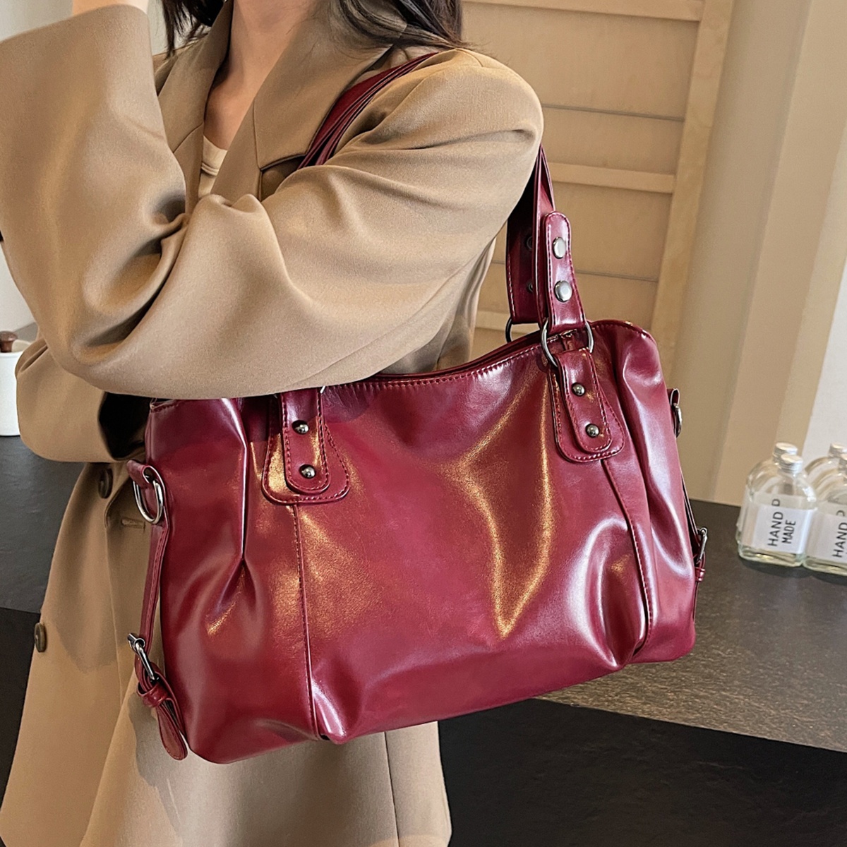 The large-capacity interior allows you to carry everything you need for your daily routine, from your phone and wallet to makeup and keys, all while keeping your belongings organized. The adjustable single-shoulder strap allows for comfortable wear as a crossbody or underarm bag, providing flexibility for different styling options. This handbag is ideal for women who appreciate both style and function, offering a sleek, fashionable solution for everyday use.