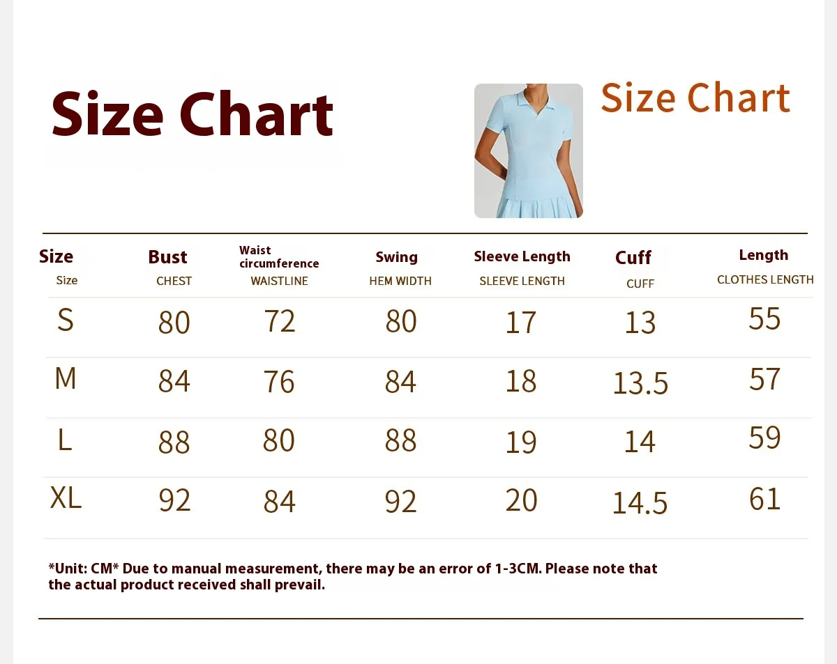 Color: elegant white (short sleeve top + short skirt), cherry blossom powder (short sleeve top + short skirt), ice blue (short sleeve top +