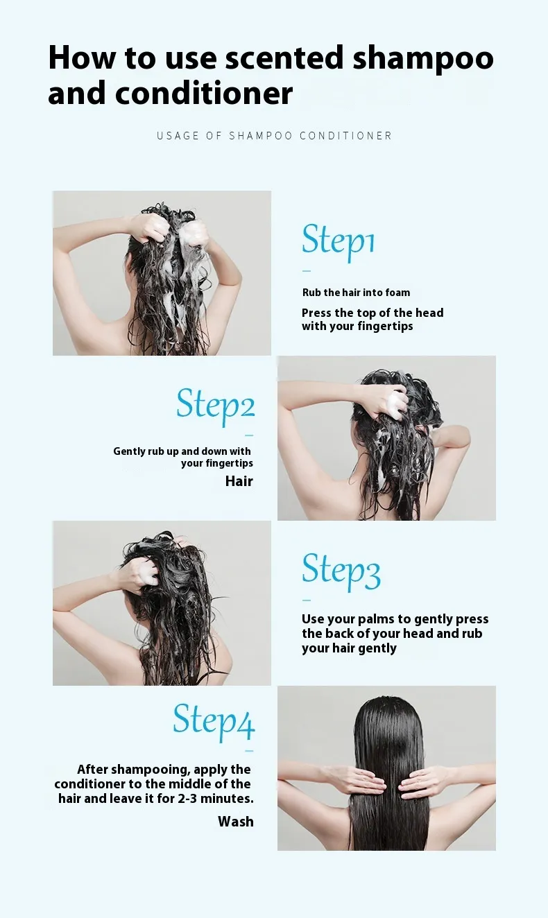 Following the shampoo, the fragrance conditioner provides an additional layer of hair care. Conditioner helps smooth the hair cuticle, which improves hair texture and reduces tangling. This makes hair easier to comb and style after washing.