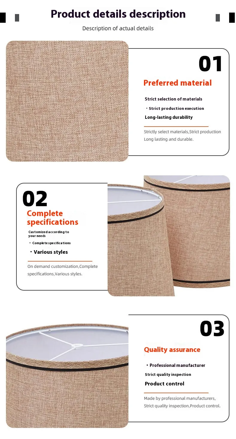 The Lamp Shades are crafted from premium materials such as linen, cotton, glass, metal, rattan, or fabric blends, designed to diffuse light evenly and create inviting atmospheres. Each shade features a sturdy internal frame and precise stitching or moulding for durability and timeless appeal.