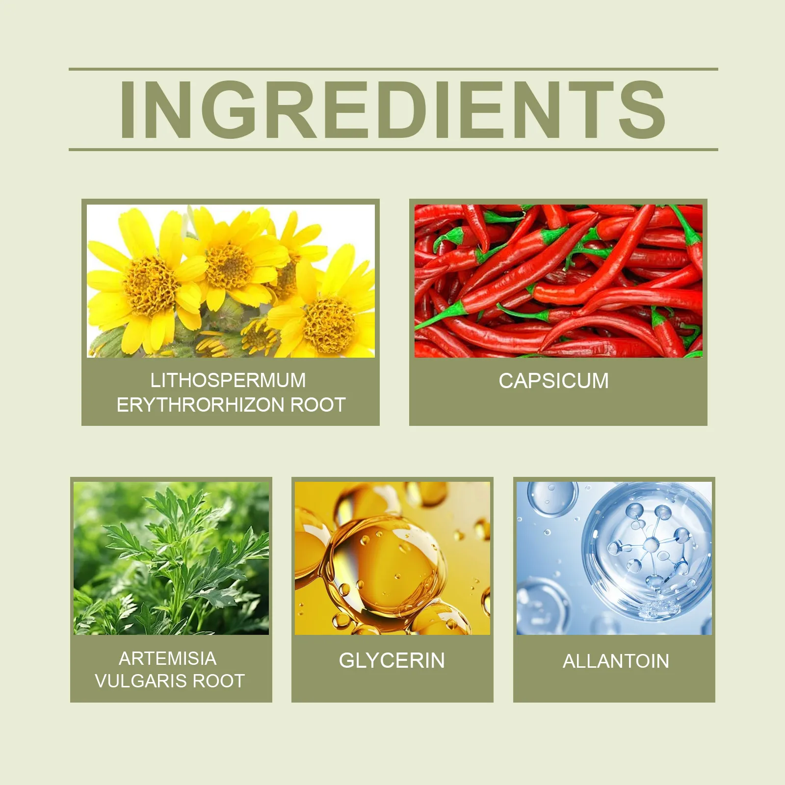 Product Ingredients: active ingredients: Arnica flower, pepper, mugwort root