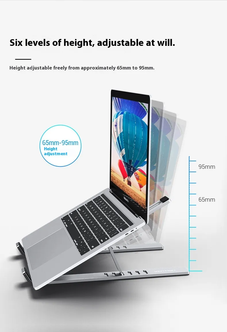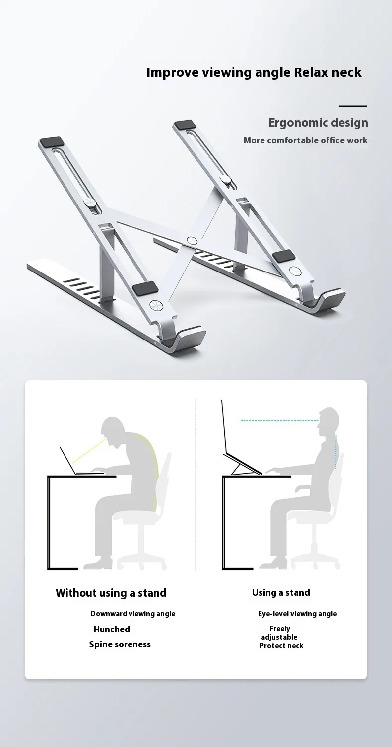 Featuring a ventilated design, this laptop stand enhances airflow around your device, preventing overheating and ensuring longer laptop performance. The aluminum alloy material efficiently dissipates heat, keeping both your laptop and workspace cooler.