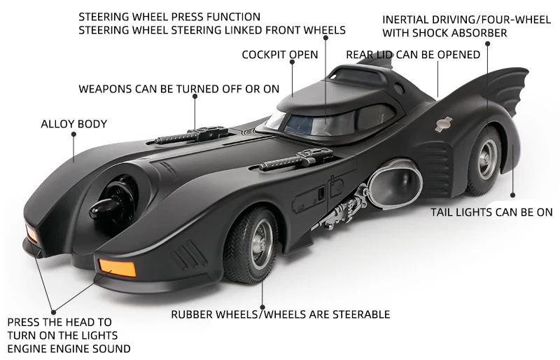 Crafted with meticulous attention to detail, the 1989 Batmobile Diecast Model captures the dark, powerful essence of the original car, made from alloy metal for a solid, durable build. The addition of sound and light features brings the Batmobile to life, enhancing its appeal for display and hobby enthusiasts. In this product description, we’ll explore the key features, benefits, and why this Batmobile diecast model should be an essential addition to your collection.