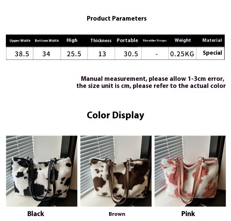 This tote bag is designed to suit a variety of occasions and outfits. Its large capacity and plush texture make it perfect for winter outings, while its elegant design ensures it pairs well with both casual and dressy looks. Whether you're heading to the office or out for a weekend brunch, this bag complements your wardrobe effortlessly.