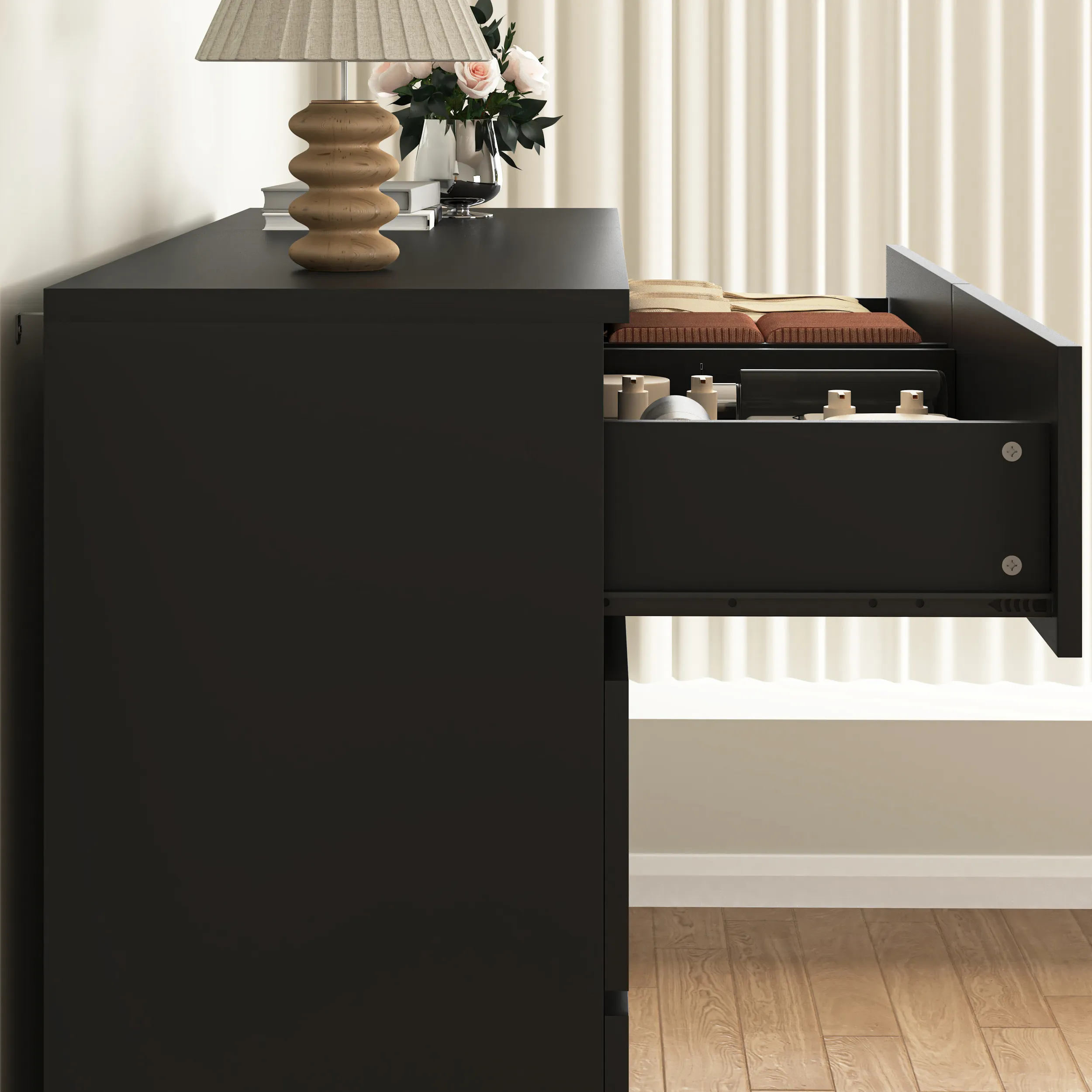 Enhances Bedroom Aesthetics: With its modern design and elegant finishes, this dresser not only offers functionality but also enhances the overall aesthetic of your bedroom.