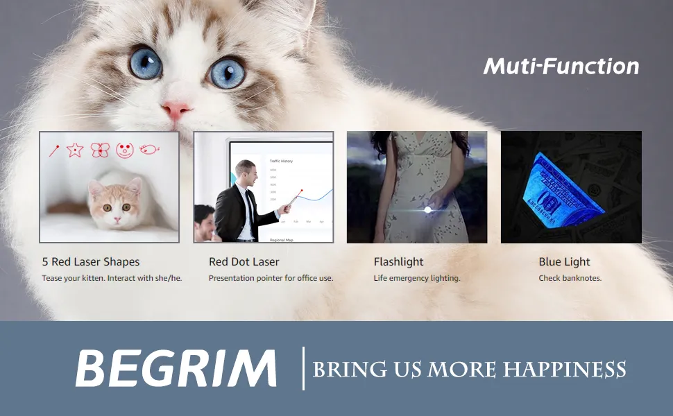 - 【7 In 1 Modes】This cat toy has 5 patterns: red dot, mice, butterfly, smile face, star. Scoll the black gear on the head to change to 3 different modes: red, purple, white. You can use the purple to check couterfeit currency and check your pets. White mode can be used for emergency lighting. The red mode can be used to play with your cat or for PowerPoint presentation.