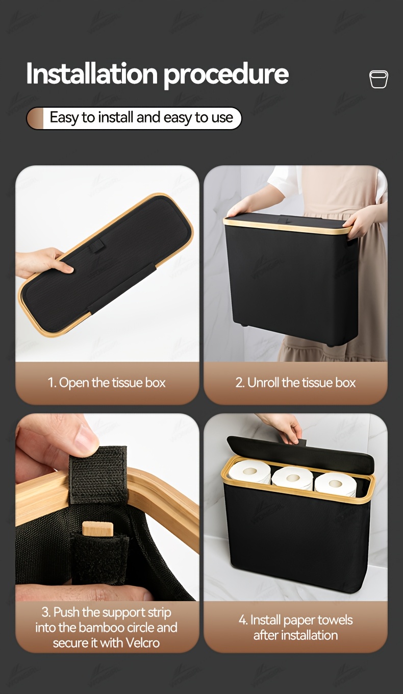 With a no-drill installation system, it attaches securely to smooth bathroom walls using strong adhesive backing, making it perfect for renters or anyone who wants an installation without tools or damage. Compatible with standard toilet rolls, the holder ensures smooth dispensing while the basket keeps backups clean, dry, and organised.