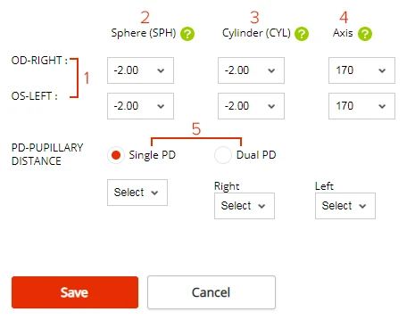 Explaination: 1.OD-RIGHT = Right Eye OS-Left = Left Eye 2.Sphere (SPH)=Spherical, is the strength of our prescription, "+"refers to farsightedness and presbyopia, "-"refers to nearsightedness. If "PL" or "Plano" is stated at the place of SPH on your prescription, please enter 0.00 for this option. 3.Cylinder (CYL) = Cylindrical, is the diopters degree of the astigmatism. This number also has "+" or "-" signs. If "DS"or "SPH" or "spherical" or "PL" is stated at the place of CYL, it means you have no astigmatism and 0.00 is the option required to choose. 4.AXIS, is a number between 0 and 180 degrees, and means the orientation of your astigmatism. There is no sign before this number. 5.PD-PUPILLARY DISTANCE = Pupillary Distance |