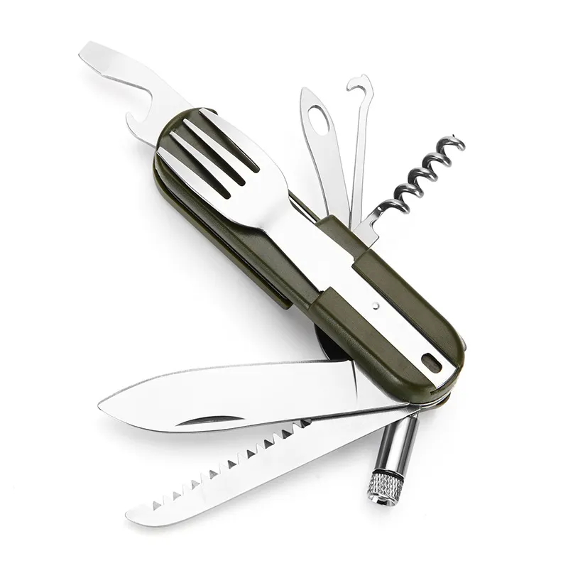 Function: forks, spoons, knives, bottle opener, saws and other functions, LED lights: Open: clockwise rotation. Closed: Shun clockwise