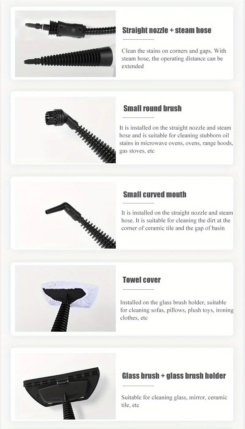 - Herramienta de limpieza multifuncional: equipada con múltiples accesorios, esta limpiadora a vapor es lo suficientemente versátil para cocinas, baños, interiores de automóviles y otras superficies.