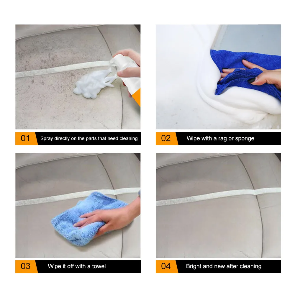 Simplemente rocíe la espuma directamente sobre el área que desea limpiar y observe cómo el limpiador elimina y descompone las manchas y la suciedad difíciles. La espuma es fácil de aplicar y no deja residuos, lo que la convierte en una solución sencilla para la limpieza de su auto.