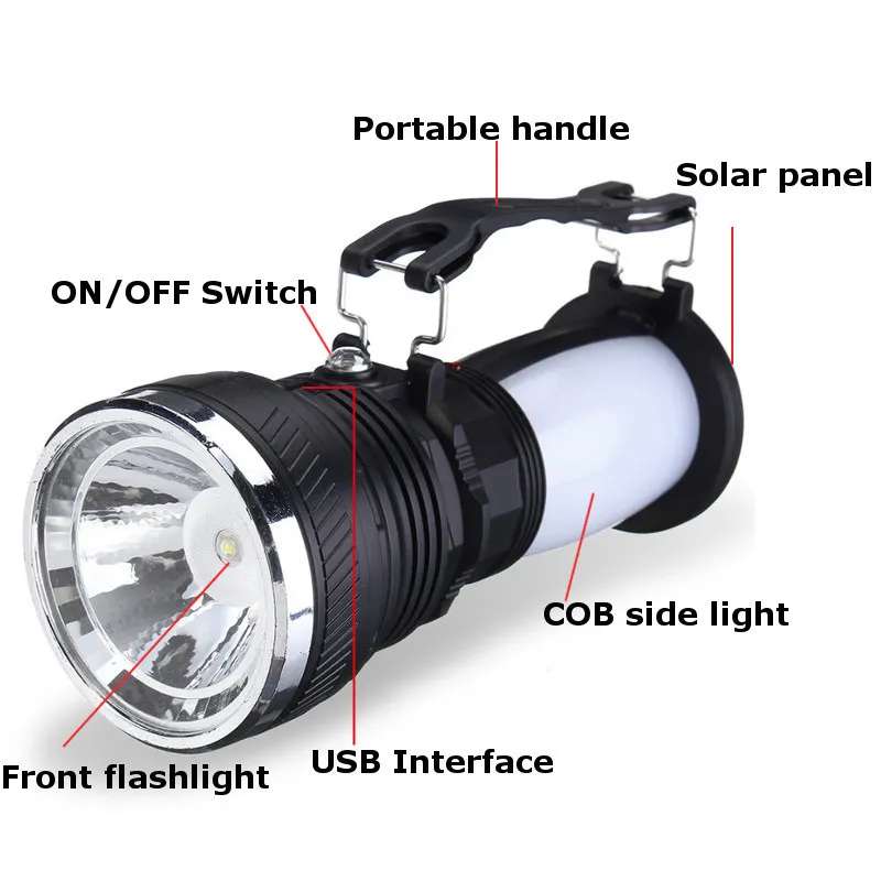 La linterna para tienda de campaña cuenta con múltiples modos de iluminación, lo que te permite ajustar la intensidad y el alcance de la luz según tus necesidades. Ya sea que necesite un haz enfocado para una visibilidad de larga distancia o un haz suave y amplio para leer o montar un campamento, esta linterna tiene el modo adecuado para usted. La capacidad de cambiar entre diferentes intensidades de luz hace que esta linterna sea versátil para diversas tareas en el campamento. Además, los ajustes garantizan una duración óptima de la batería, lo que permite ahorrar energía cuando no se necesita el máximo brillo. Información del producto: 1. Este producto funciona con energía solar de 110-250 V, se puede transportar con la mano y tiene la función de suspensión multifunción. 2. Botón 1: enciende los faros delanteros. Botón 2: enciende las luces laterales. Botón 3: enciende una luz lateral. Botón 4: se corta la alimentación. 3. Batería recargable de gran capacidad sin mantenimiento (1000 MAH). 4. Bombilla LED importada con luz blanca superbrillante verde, de bajo consumo y alta luminosidad. 5. Función de carga solar. 6. Asa plegable, más cómoda de usar. Indicadores técnicos
