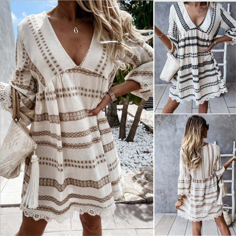 Long Sleeve Geometric Print Dress Fashion Loose Stitching V-neck Lace Cuff Dresses Womens Clothing