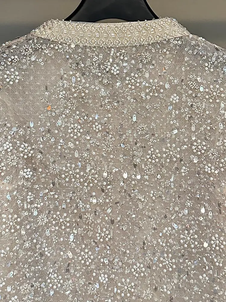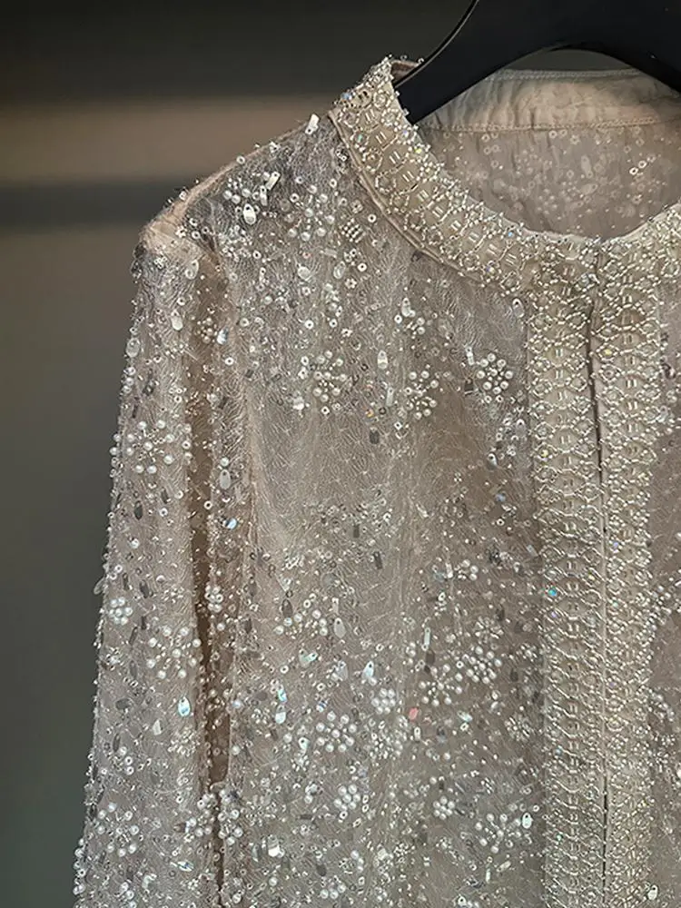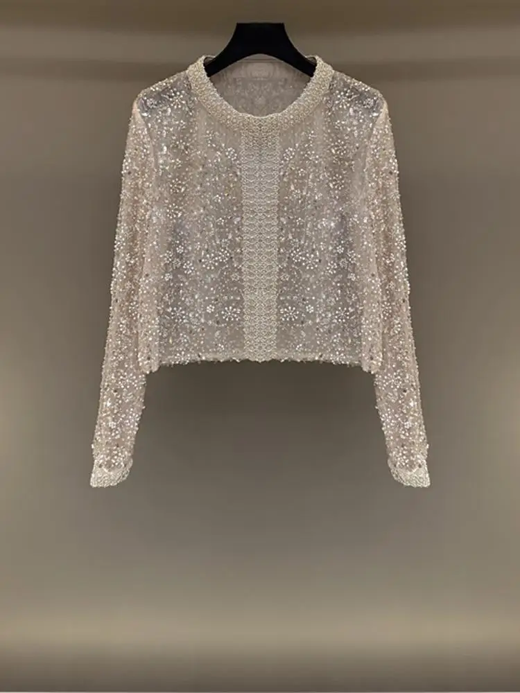 Luxury Beading Coat Women Heavy Industry Sequined See Through Long Sleeve Round Collar Short Tops Summer Fashion Trendy