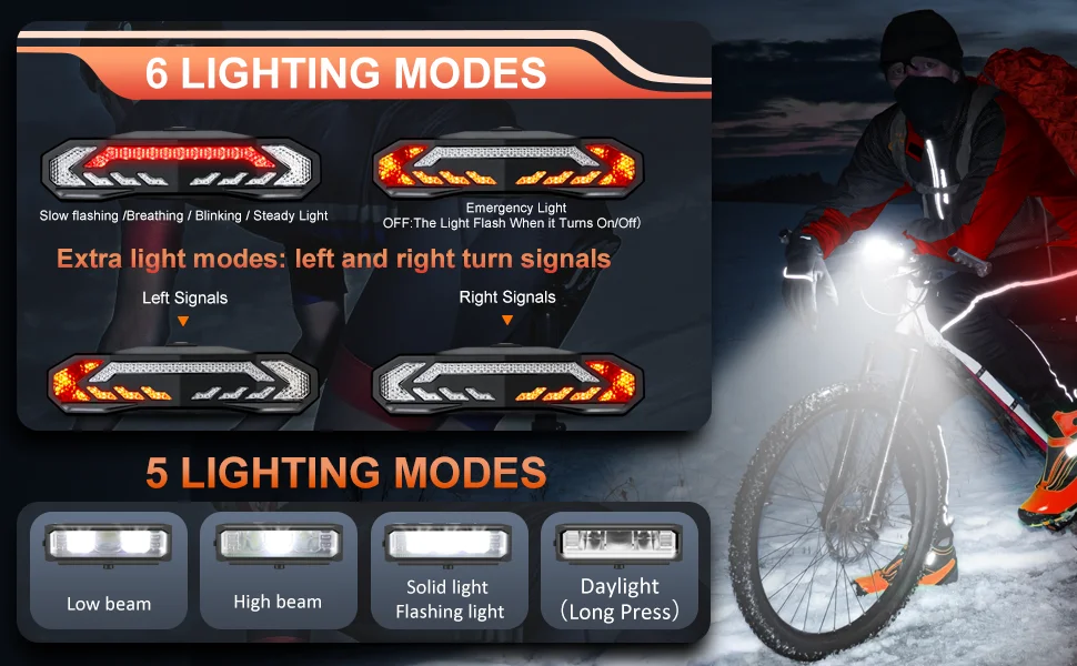 ● [COMBINACIONES DE FAROS DELANTEROS Y TRASEROS PARA BICICLETA]: Enciende tu bicicleta con las luces delantera y trasera al mismo tiempo. La luz delantera principal y la luz roja trasera tienen múltiples configuraciones para ajustar el brillo y la secuencia de parpadeo. Luz ultrabrillante que ilumina una amplia zona para llamar la atención de los conductores y es útil para cualquier desplazamiento nocturno. [Además, las luces traseras vienen con intermitentes y alarmas de bicicleta , a través del control remoto inalámbrico].