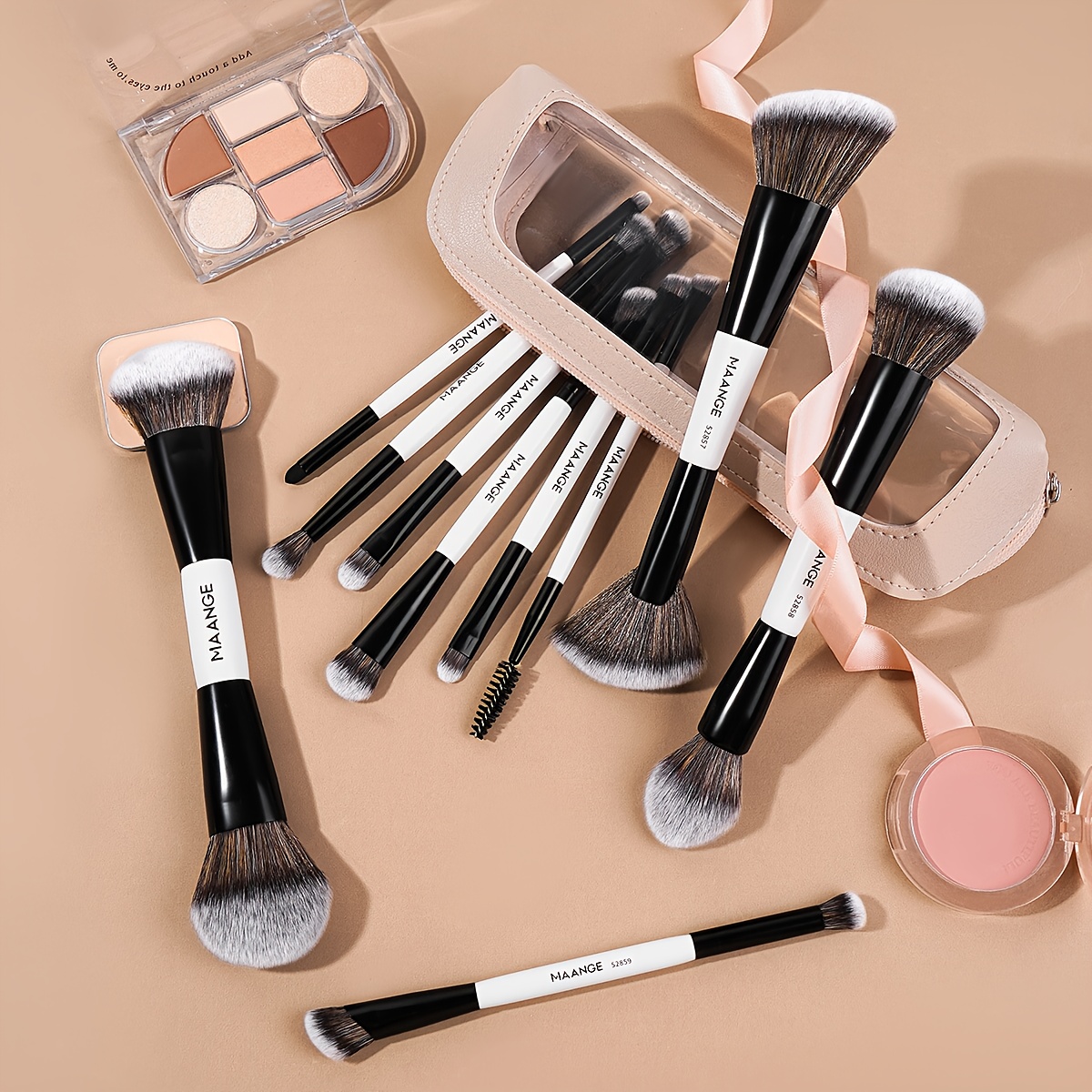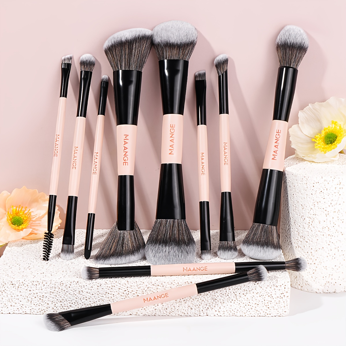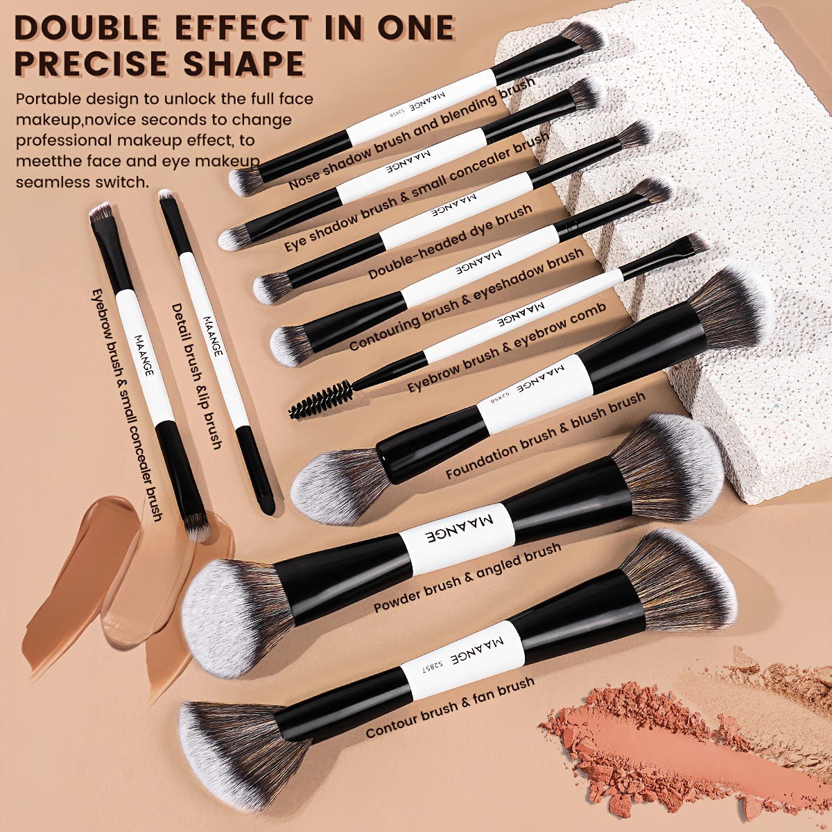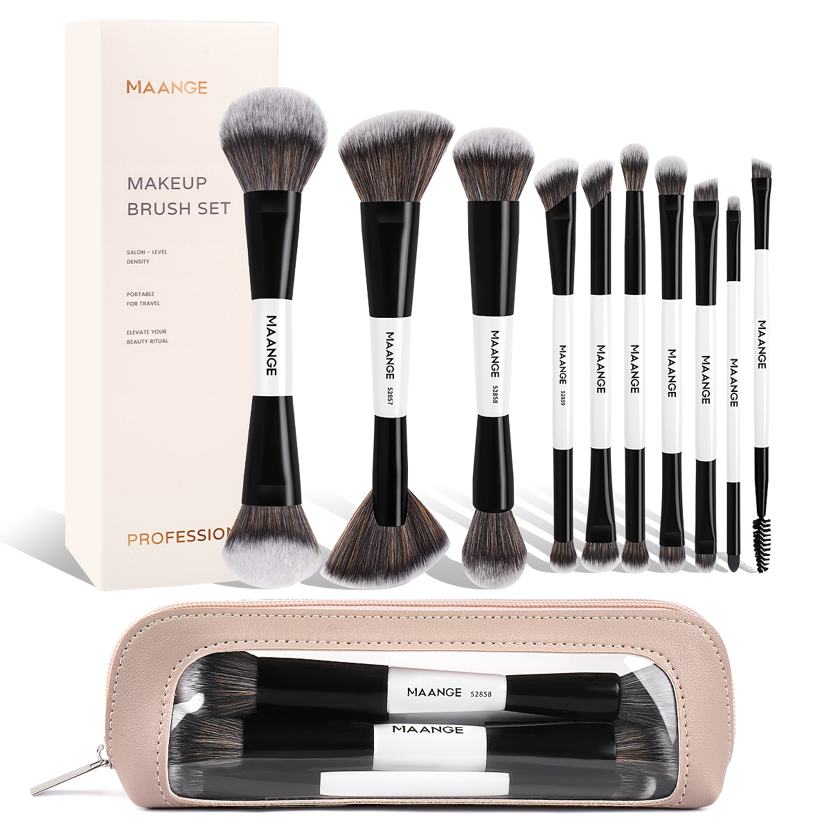 The MAANGE 10pcs Professional Double-Headed Blush & Eyeshadow Makeup Brush Set includes 10 high-performance brushes with double-ended design, making it easy to apply a variety of makeup products, including blush, eyeshadow, and powder. The double-ended feature allows for precise application in a more compact, versatile tool.