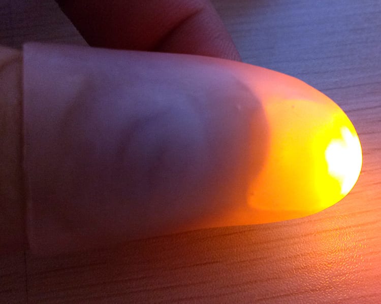 - Each soft plastic thumb tip comes with a built-in battery, switch and a bright red led light.