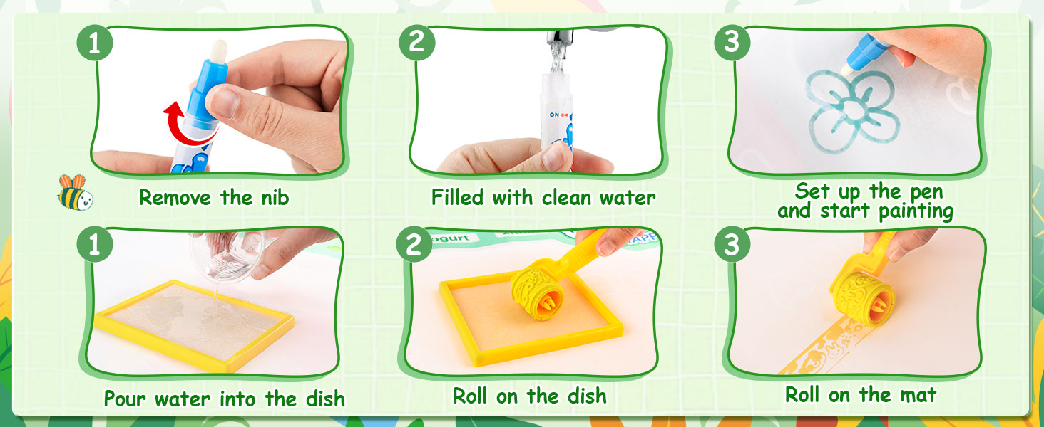 Just add water - No Ink-No paint-No toxic-Non chemical.Save trouble for you & Safe toy for your kid - Disappear automatically - Durable high-quality.