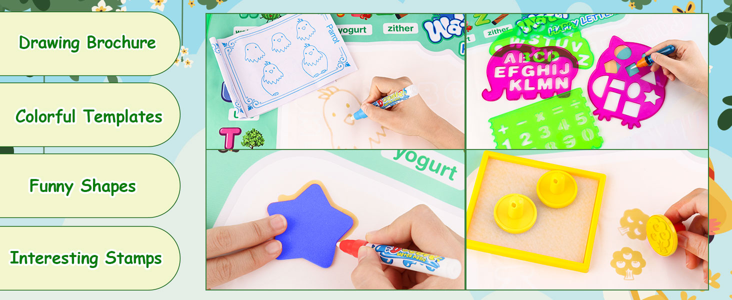 Moreover, the inclusion of educational elements like stencils and a picture album transforms the canvas into a comprehensive learning tool. Whether it's practicing the alphabet, numbers, or shapes, children can learn while they play, making the Magic Water Canvas an invaluable addition to any child's developmental journey.