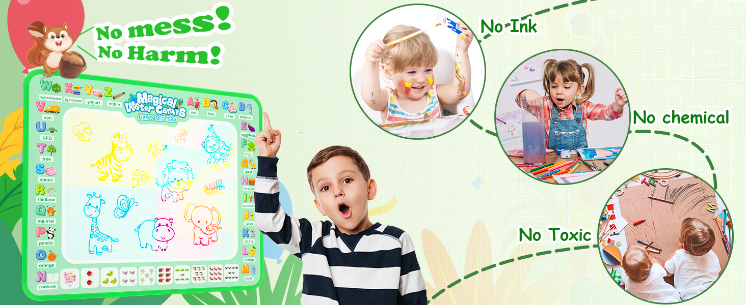 - Educational Toys:No Ink,No Paint,Non-Polluting,Never make a mess.The back of the mat is water-resistant nylon material,clean and safety for kids. The traces will never be chaotic, satisfying the imagination and creativity of the kids' infinite painting.