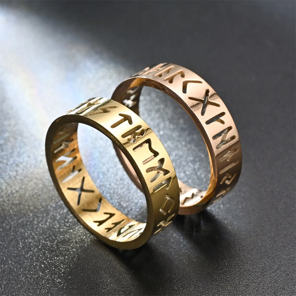 Main Stone Color: Black, Ring Size: 2 - 2023 New Stainless Steel Hollow Out Ring for Men Women Fashion Hollow Rune Design Finger Anillo Antiestres Anxiety Rings