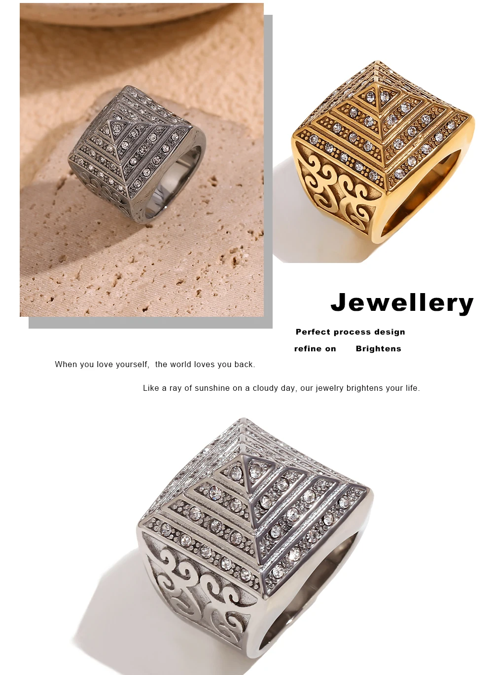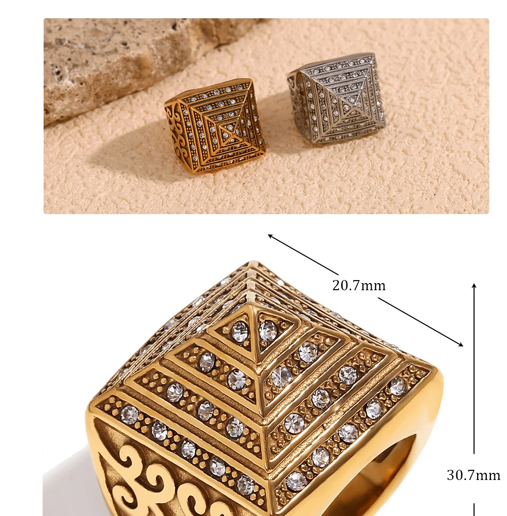Make a bold statement with the MamacitaSlay New In Vintage Four Story Pyramid Vine Waterproof Men Ring, a luxurious piece