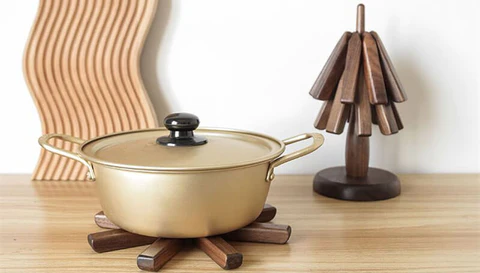 Hecho de nogal negro, este mantel de madera aísla el calor con su base gruesa y garantiza que la superficie de la mesa no se dañe.