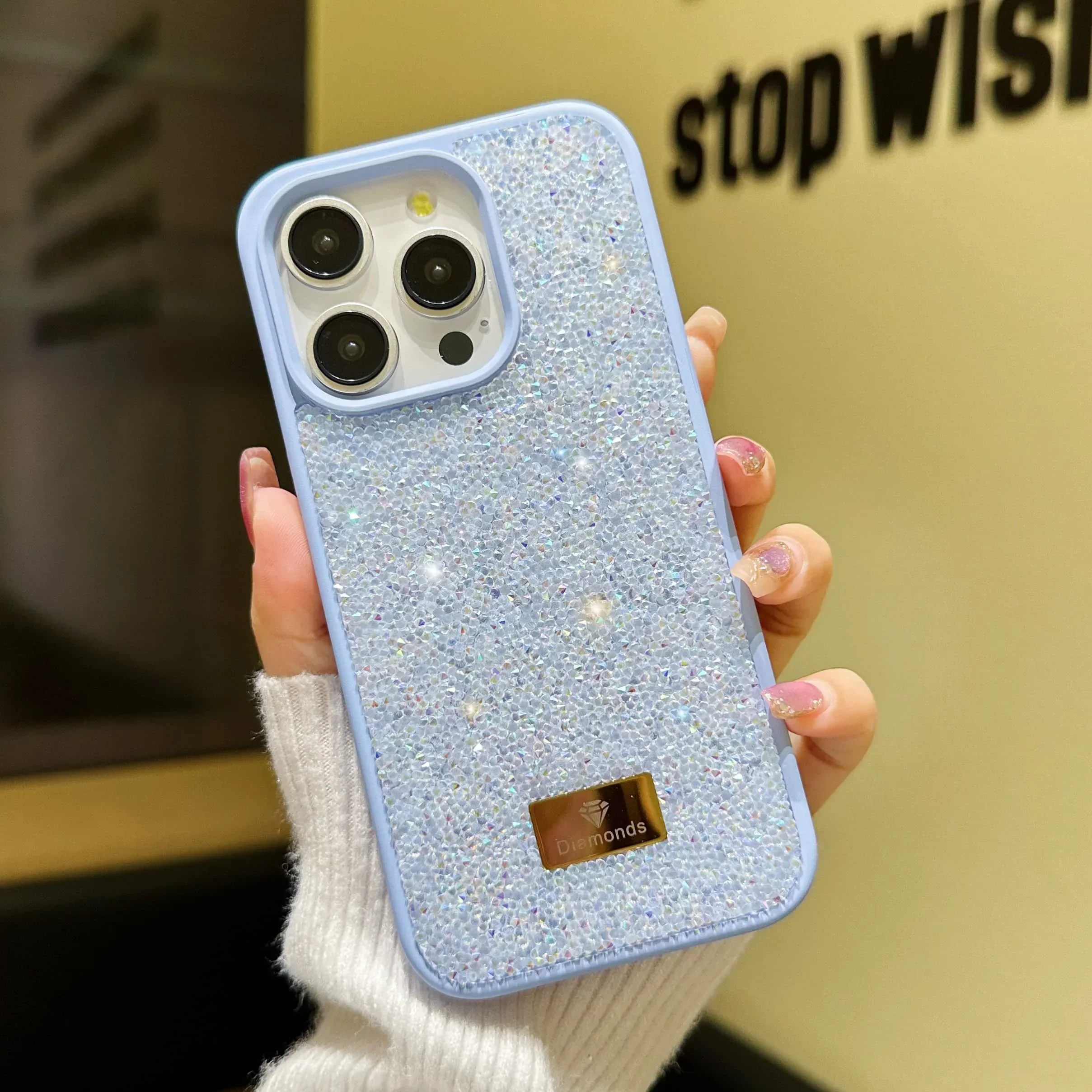 Material: CANVAS, Color: Blue - Luxury INS Dazzling Full Covered Zircon Macaroon Color Phone Case for iPhone 16 15 14 11 12 13 Pro Max Plus Back Cover