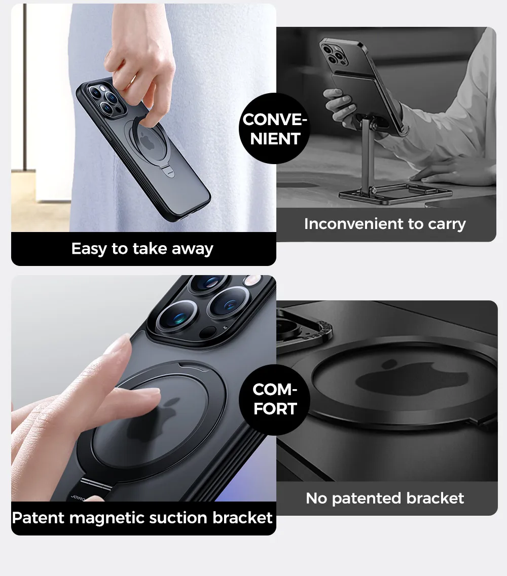 �� All-New Magnetic Series - Beyond BeingticiansAfter years of deliberate planning and designing, Joyroom is the FIRST TO ENGINEER the brand-new Invisible Magnetic Series for iPhone 14 Pro Case. We combined the strong magnetic technology with a foldable kickstand by applying our compact and practical design philosophy. MagicStand case for iPhone 14 Pro easily attaches to all Magnetic accessories. The versatile kickstand on the back of the phone case folds back into a groove when unused.