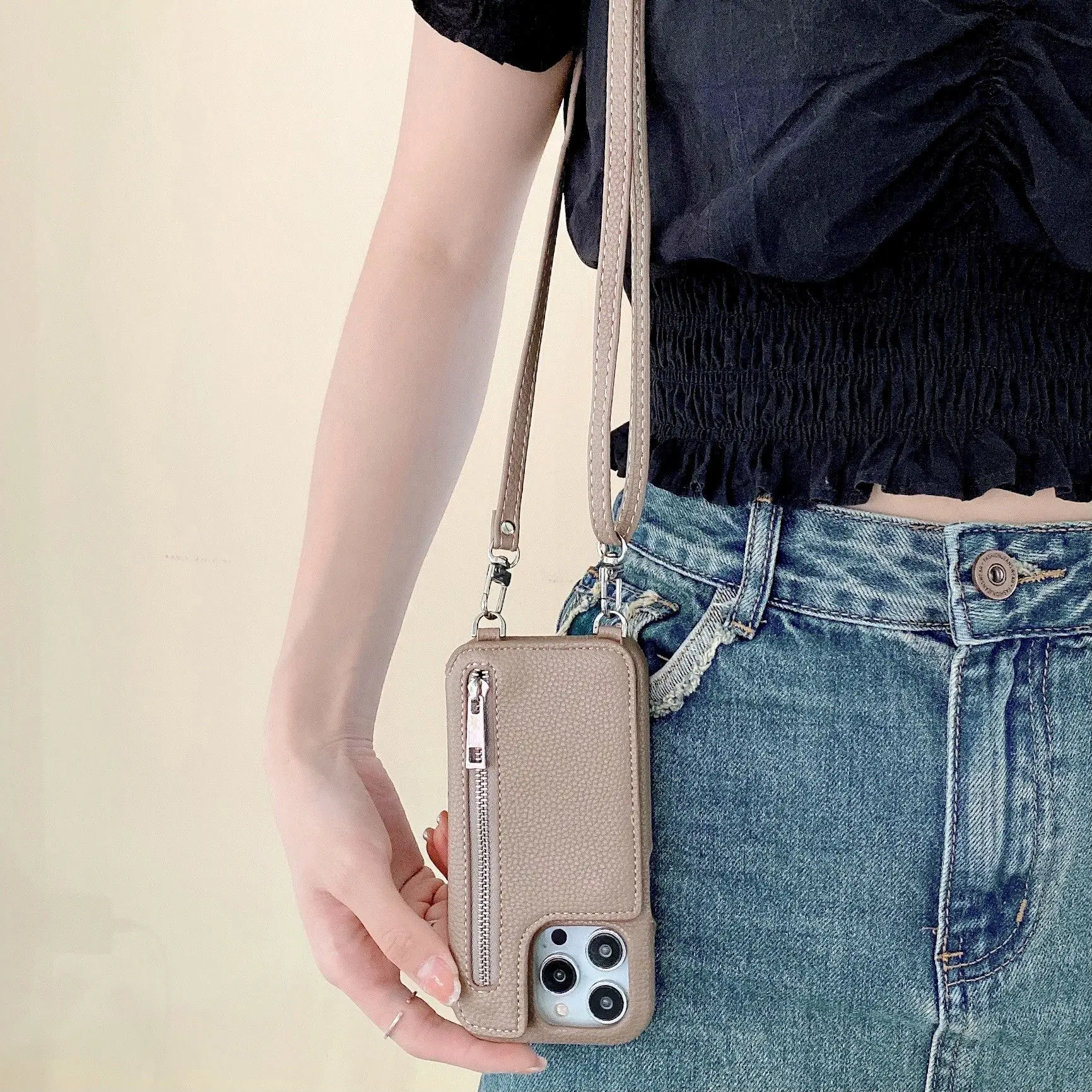 Zipper Wallet Makeup Mirror Crossbody Lanyard Phone Case For iPhone 16 15 14 Pro Max 13 12 11 XR XS 7 8 Plus Card Pocket Leather Cover