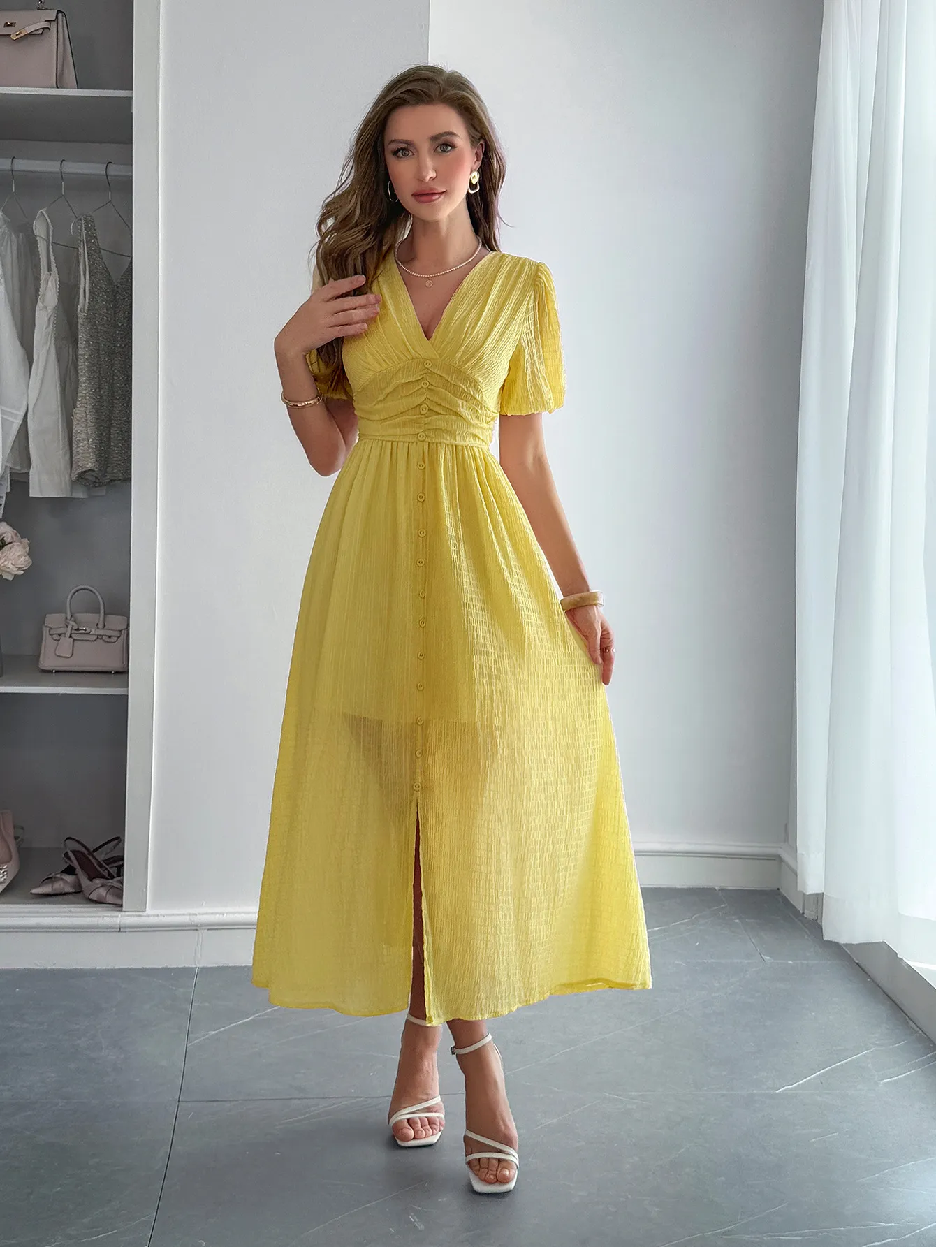 The maxi length elongates your silhouette, while short sleeves provide a relaxed and modern touch.