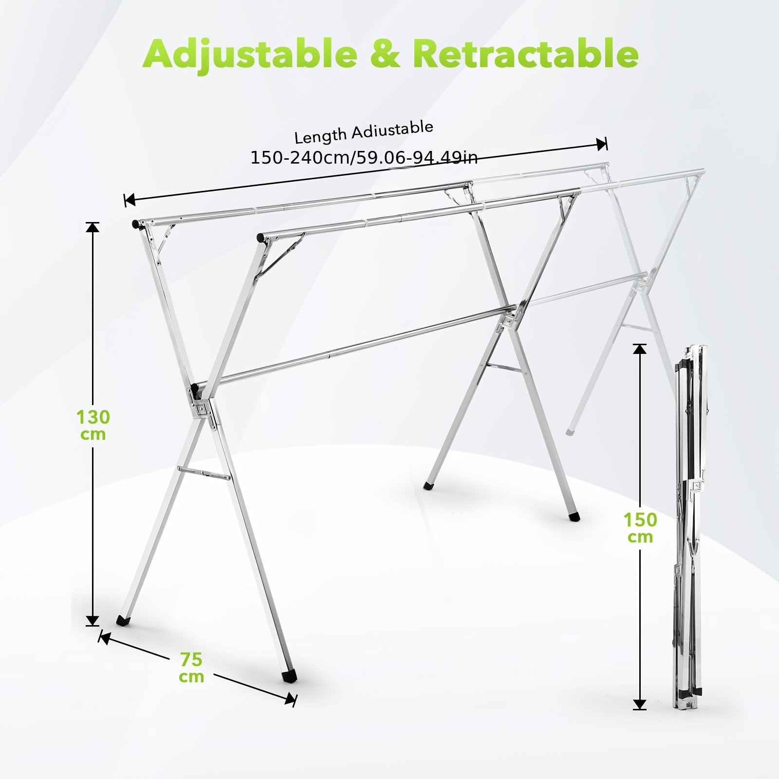 Our versatile garment rack, designed for and convenience. Crafted from rustproof stainless steel, this rack ensures longevity and resistance to corrosion. Its adjustable length, ranging from 150 to 240 cm, accommodates various clothing items, making it a flexible solution for your laundry needs. The rack is easily foldable for efficient storage when not in use. To enhance its functionality, it comes with a stainless steel pipe (150–240 cm in length), providing additional hanging spacefor larger items like blankets and sheets. The inclusion of windproof hanger hooks adds extra security, making it suitable for both indoor and outdoor use. Assembling this garment rack is a breeze, requiring only a simple 1-minute setup. Experience hassle-free organisation and enjoy the convenience of a reliable and adaptable garment rack that meets all your storage and drying needs.