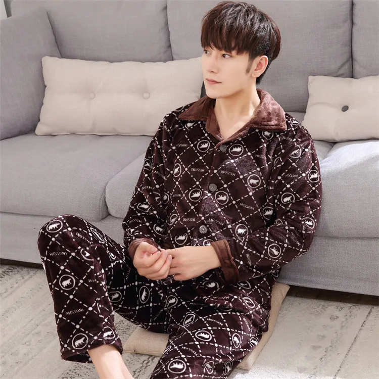 Available in multiple colors and patterns, this homewear set includes a long-sleeve top and matching pants, both made with plush flannel material that retains warmth while remaining breathable. The relaxed, roomy fit allows for freedom of movement, making this set a practical and fashionable choice for every man who values comfort.