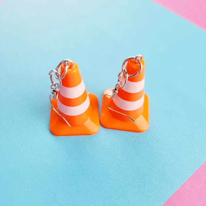 Metal Color: BROWN - Unique Orange Traffic Cone Safety Design Novel Earring Keychain - The Perfect Gift for A Friend!