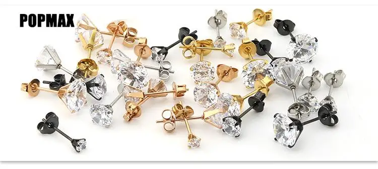 Metal Color: Gold-color, Main Stone Color: GRAY - POPMAX 1Pairs/2Pcs Stainless Steel Crystal Studs Earrings For Women Men 4 Prong Tragus Round Clear Cubic Zirconia Ear Jewelry