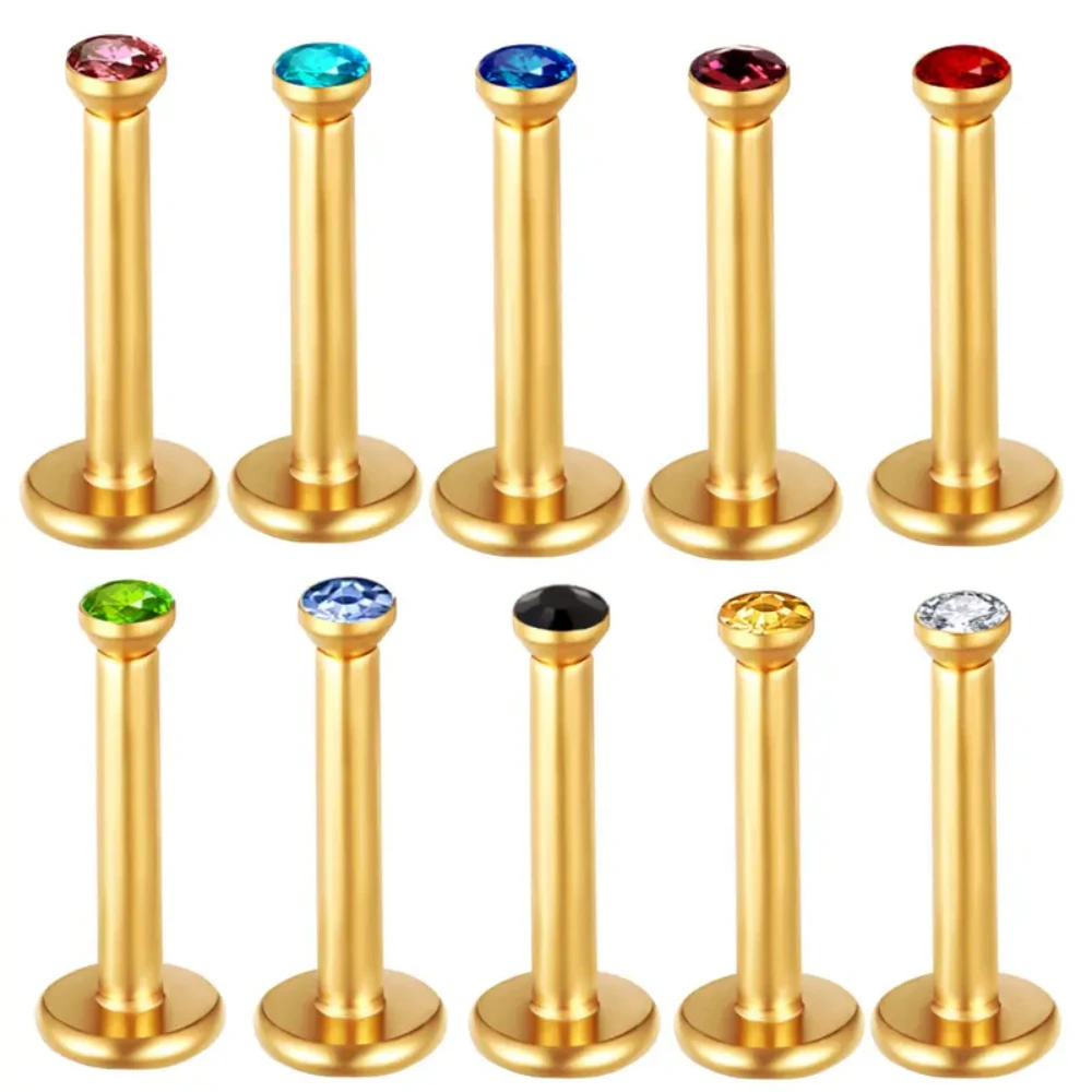 Metal color: Imitation Rhodium Plated - 2X 16g 1.2mm Crystal Steel -Gold- Labret Ring Bar Ear Cartilage Tragus Monroe Lip Nose Stud Internally Threaded Piercing