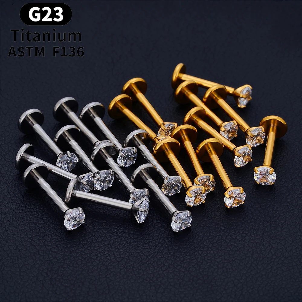Metal color: Light Yellow Gold Color, Main Stone Color: Yellow - 10PCS ASTM F136 G23 Titanium Piercing Labret Lip Ring Stud Earring CZ Ear Tragus Cartilage Helix Daith Pierc Jewelry 16/18/20g