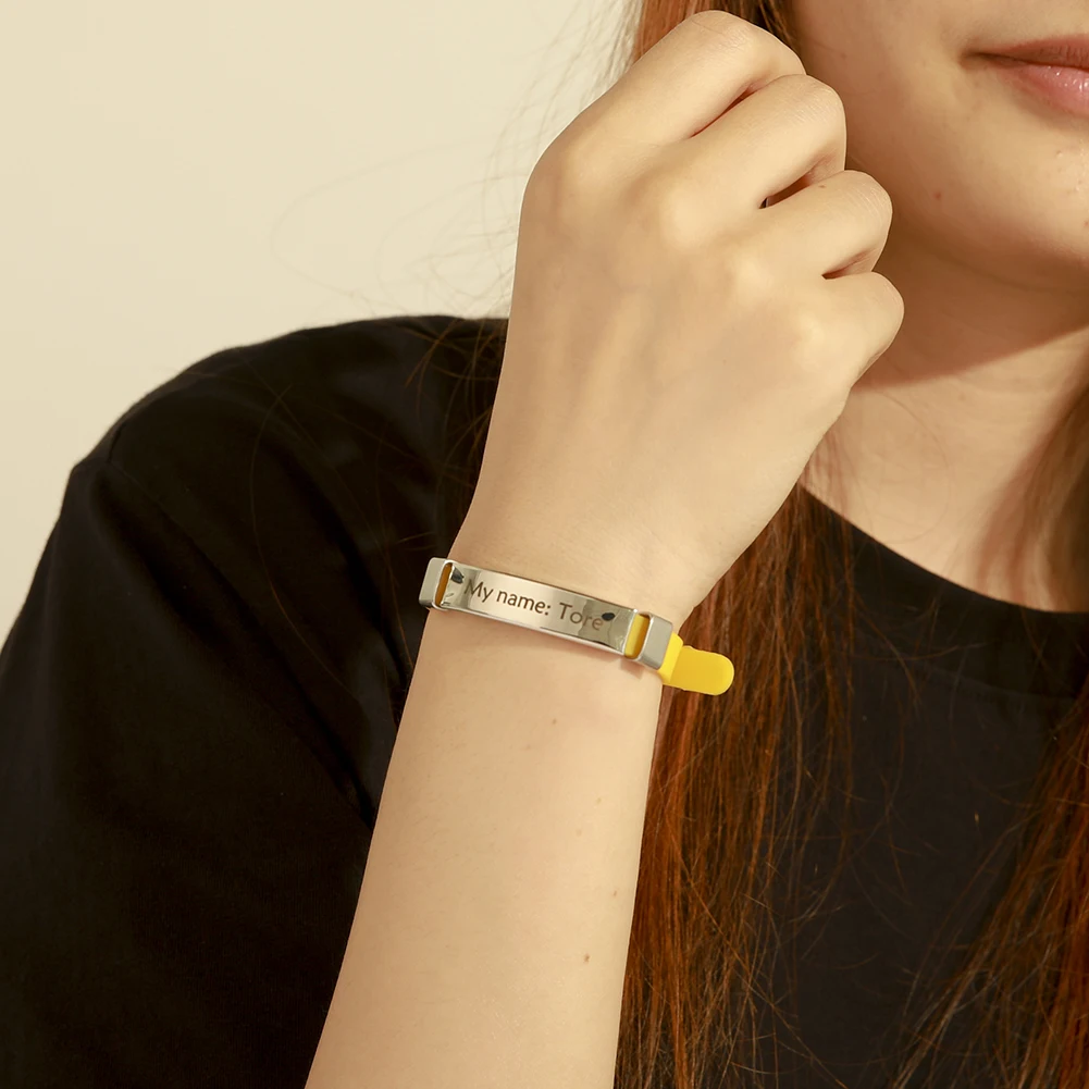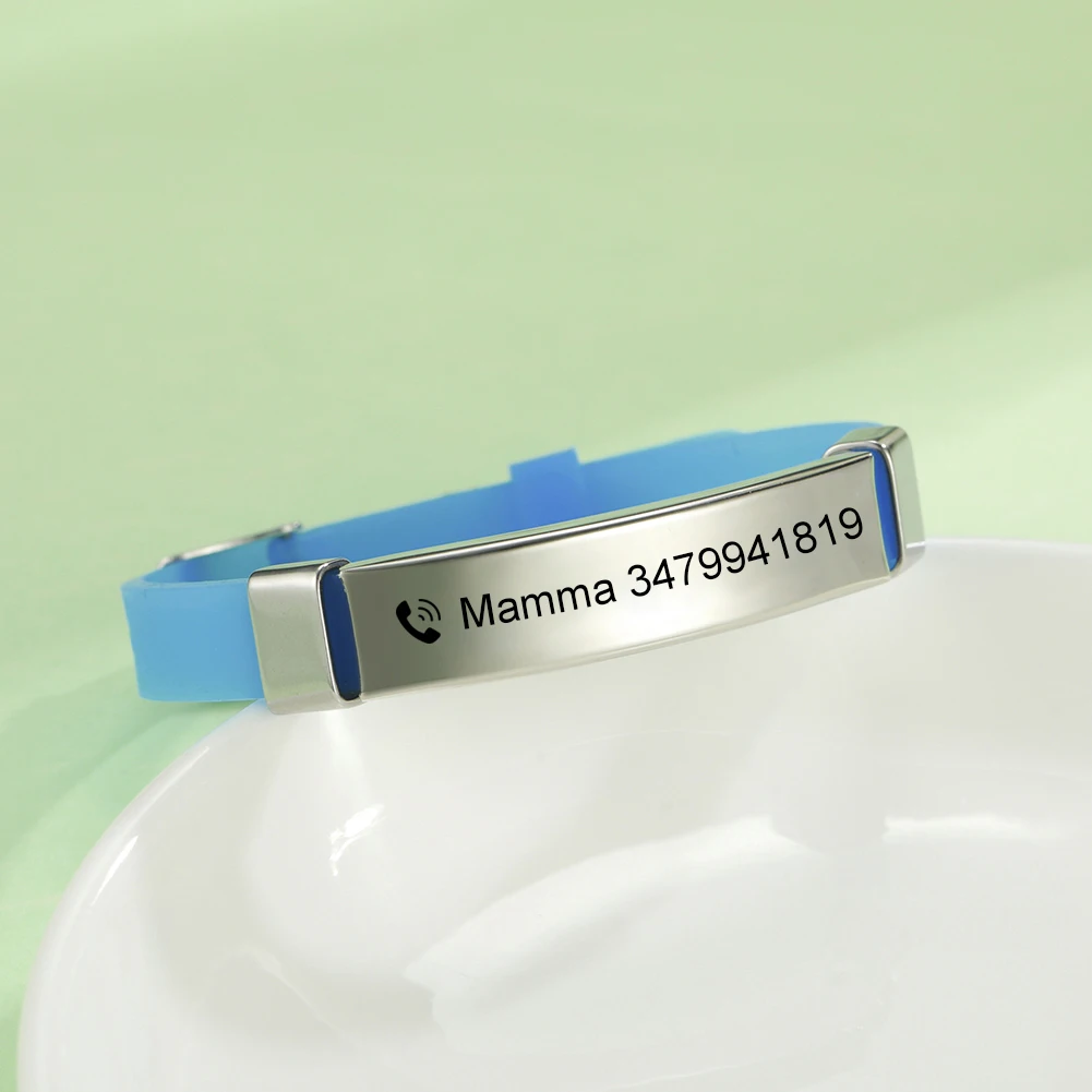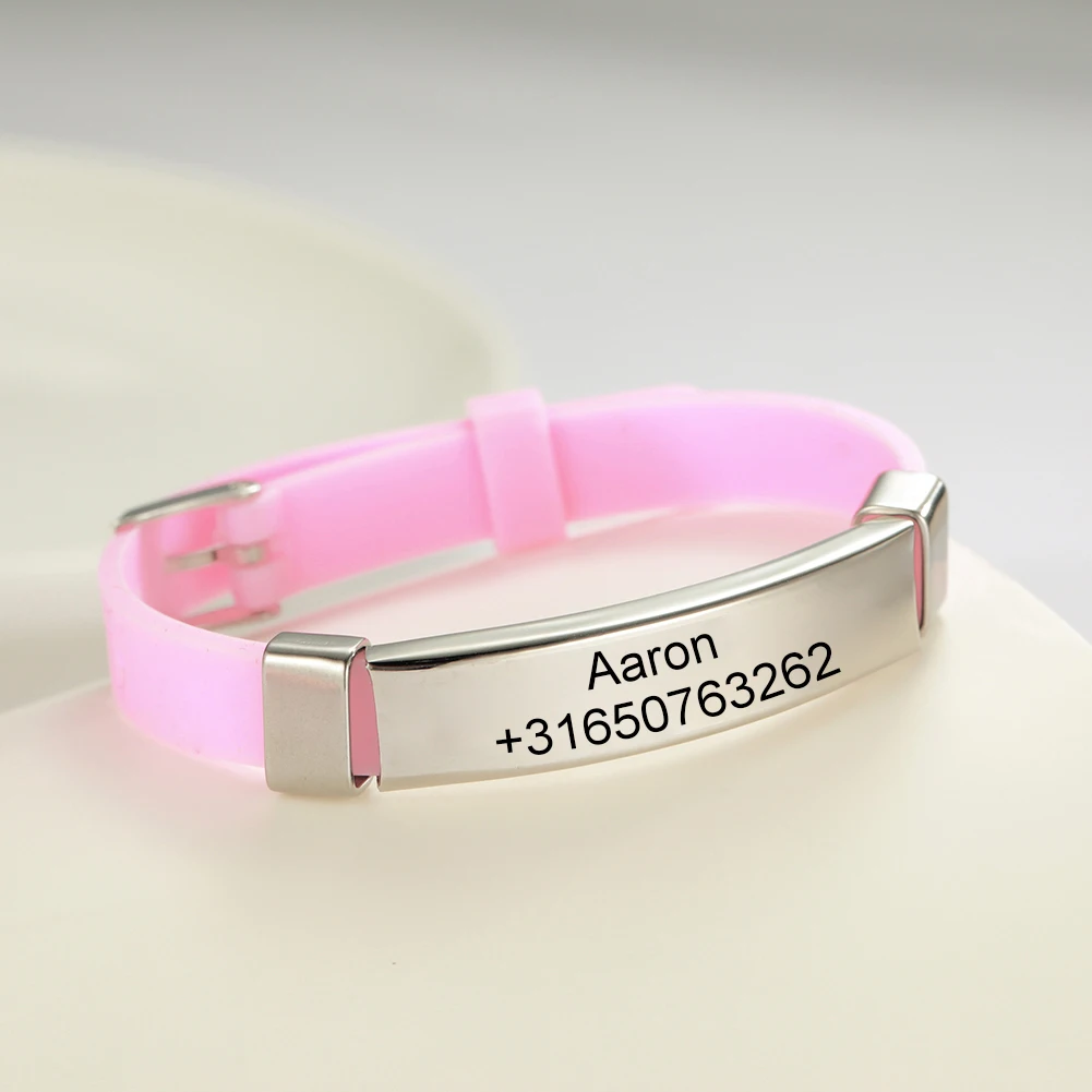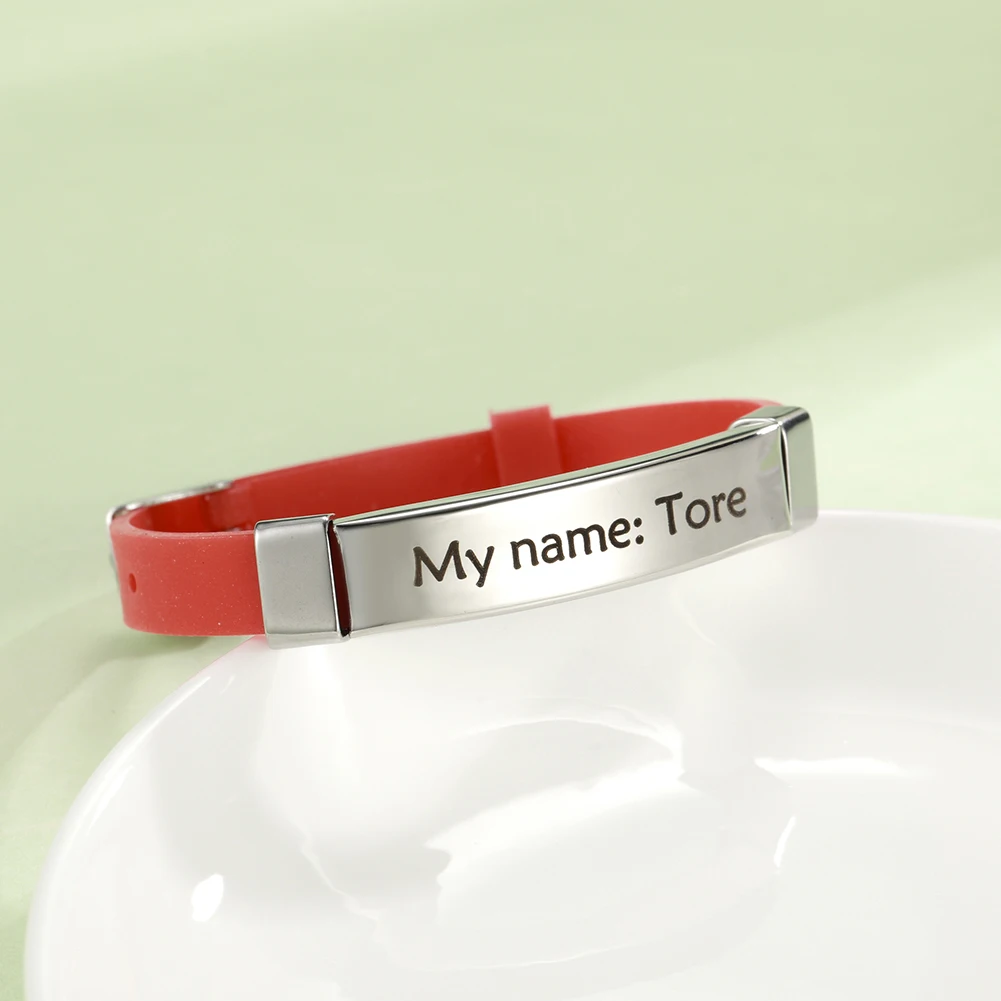 Metal Color: Red, Length: 17cm - Personalized ID Bracelet Kids Children Adjustable Soft Silicone Stainless Steel Pendant Emergency Name Phone Custom Bracelets