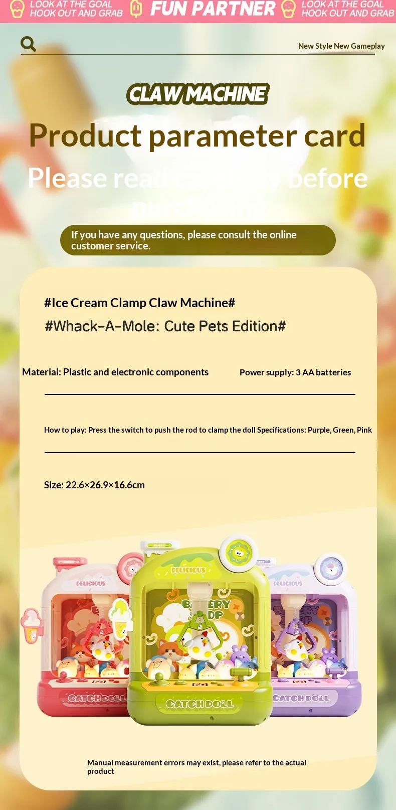 Color: Ice Cream Shop Claw Machine [Unicorn] – 30 dolls, 10 Gashapon; Ice Cream Shop Claw Machine [Little Dinosaur] – 30 dolls, 10 Gashapon;