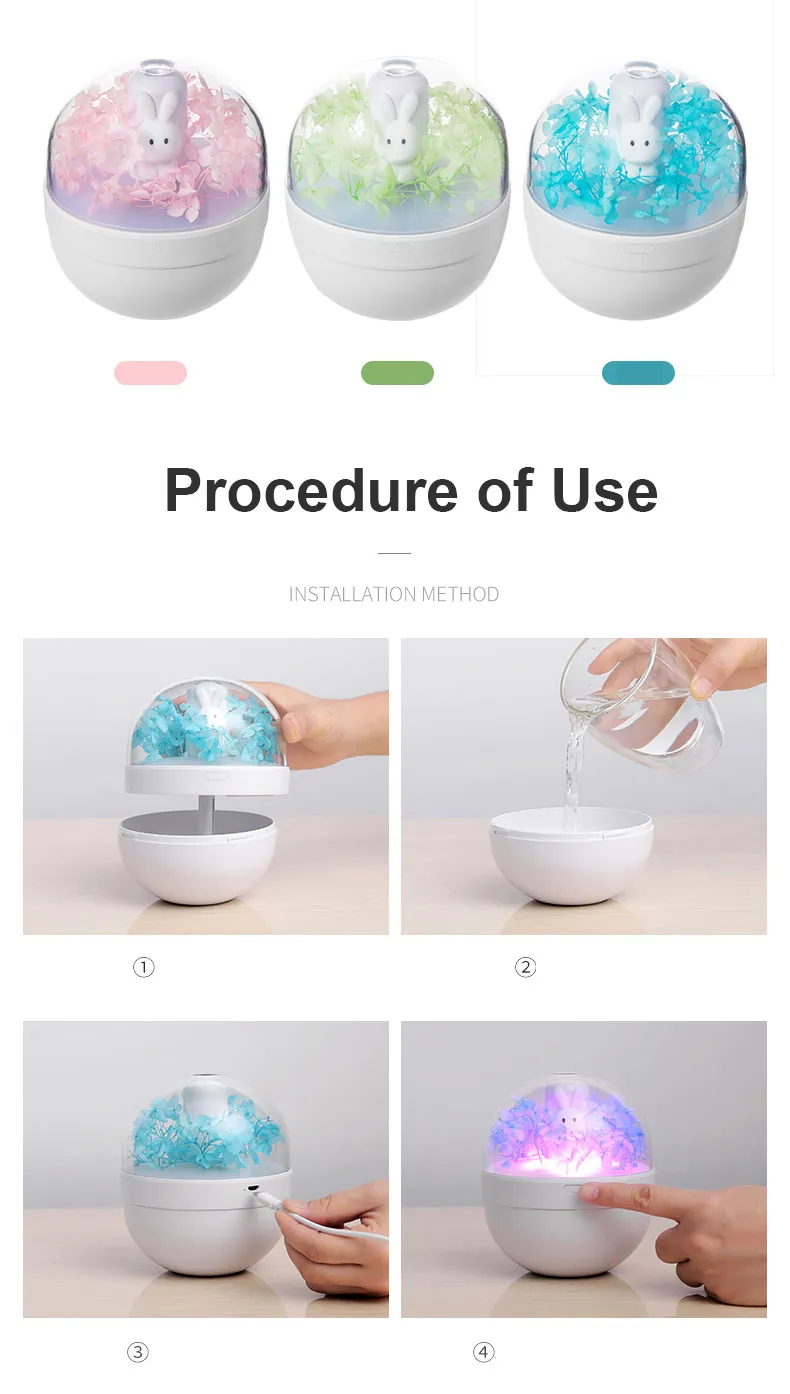 - Decoración para el hogar: Además de su funcionalidad, el minihumidificador Sweetheart Rabbit es una hermosa pieza decorativa para cualquier habitación. Añadir flores preservadas aporta un toque único y natural, complementando una variedad de estilos de diseño de interiores, desde minimalistas hasta acogedores bohemios.