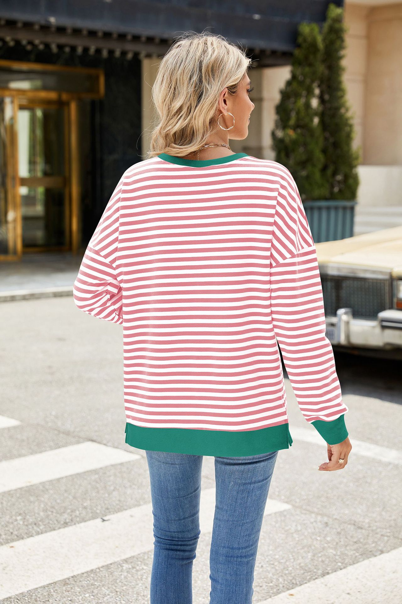 Versatility This striped pullover top is incredibly versatile, making it easy to style for various occasions. Pair it with jeans or leggings for a laid-back, casual look, or dress it up with a skirt and boots for a more polished ensemble. The mix of colors and the split design make this top a standout piece that can be worn for both casual outings and more relaxed social events.